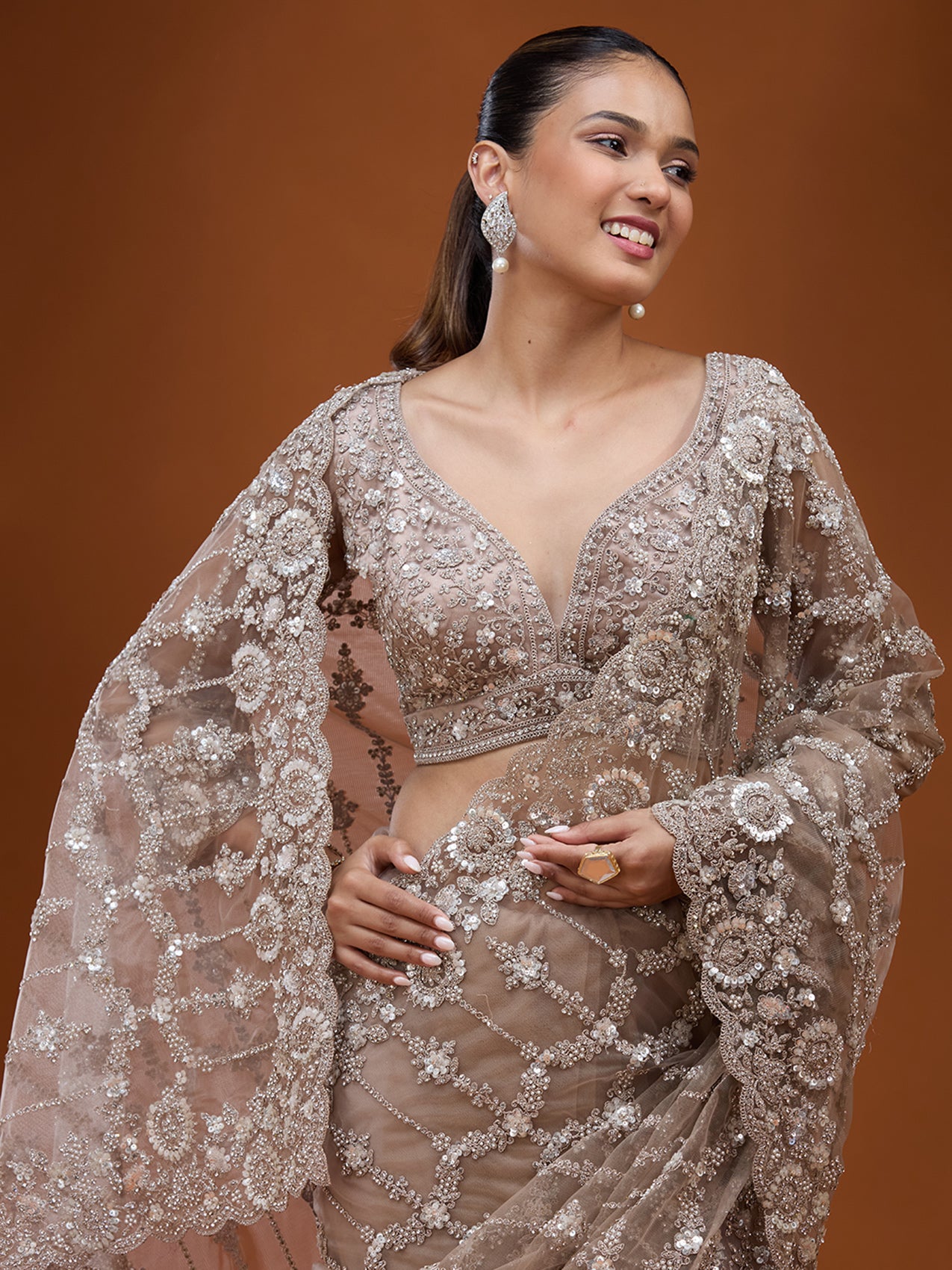 Beige Cording Net Saree