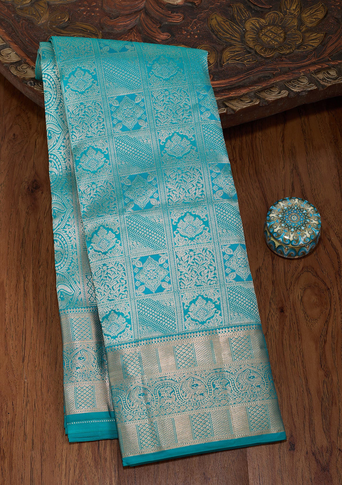 Peacock Blue Silk_Saree in Silk fabric. The Silk_Saree is elevated with Zariwork (Gold) embroidery. It comes with an Unstitched blouse. Comes with the Koskii promise of premium quality.
