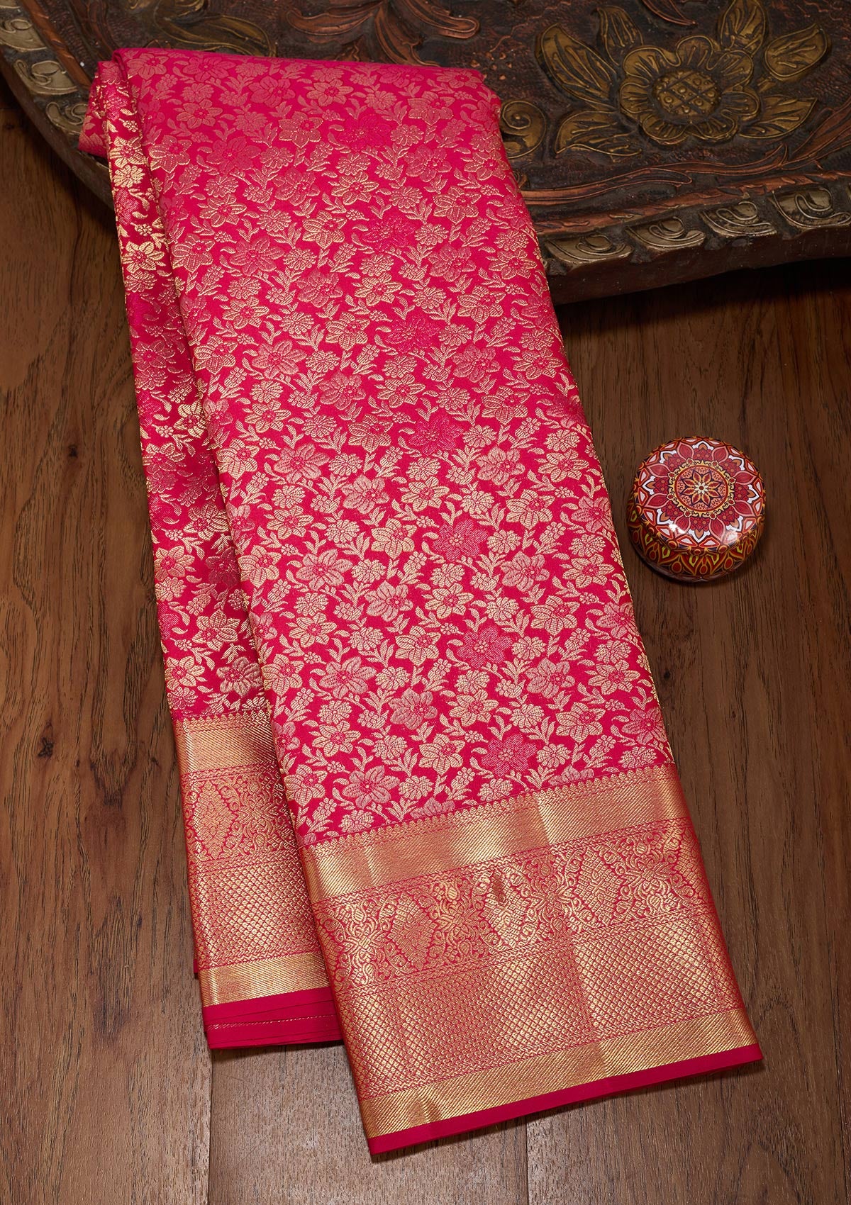 Rani Pink Silk_Saree in Silk fabric. The Silk_Saree is elevated with Zariwork (Gold) embroidery. It comes with an Unstitched blouse. Comes with the Koskii promise of premium quality.