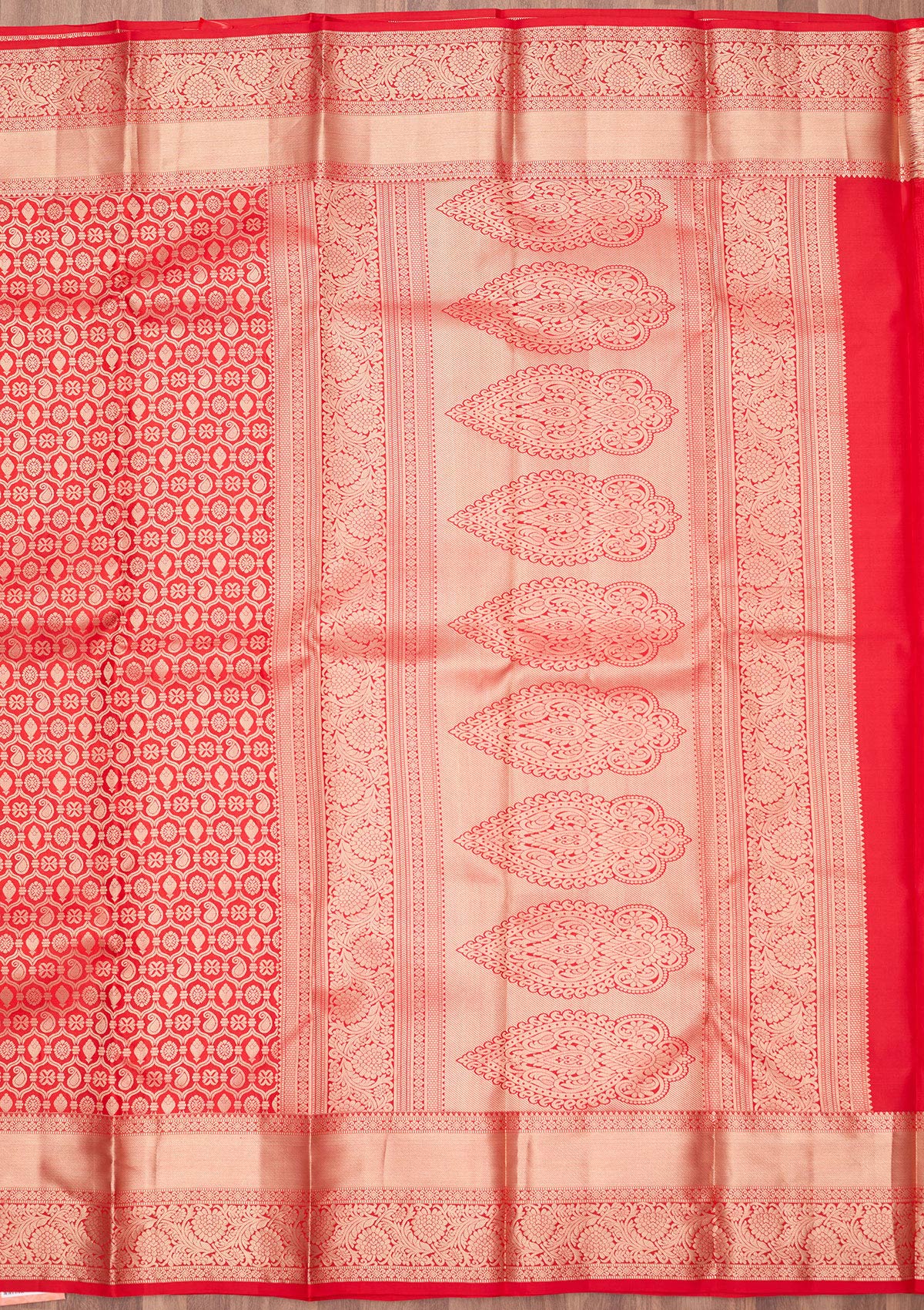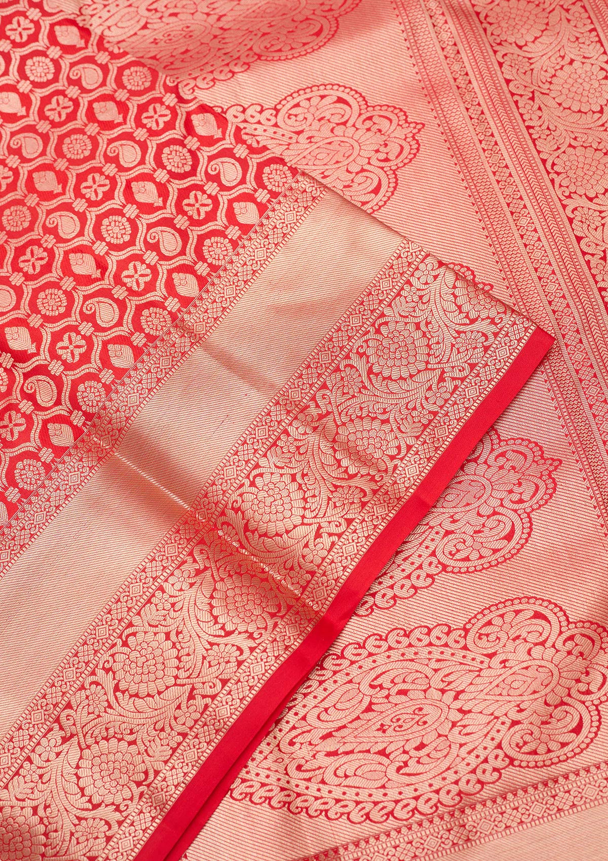 Red Silk_Saree in Silk fabric. The Silk_Saree is elevated with Zariwork (Gold) embroidery. It comes with an Unstitched blouse. Comes with the Koskii promise of premium quality.