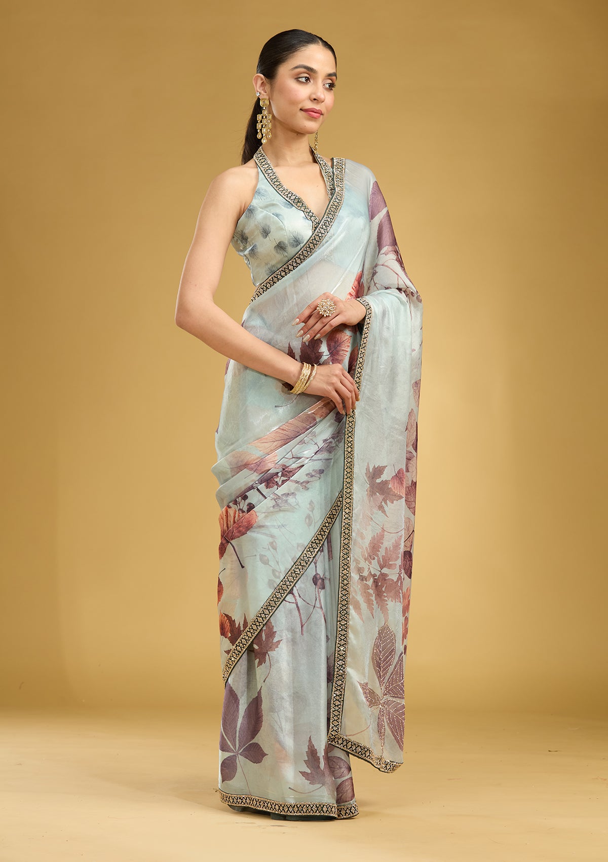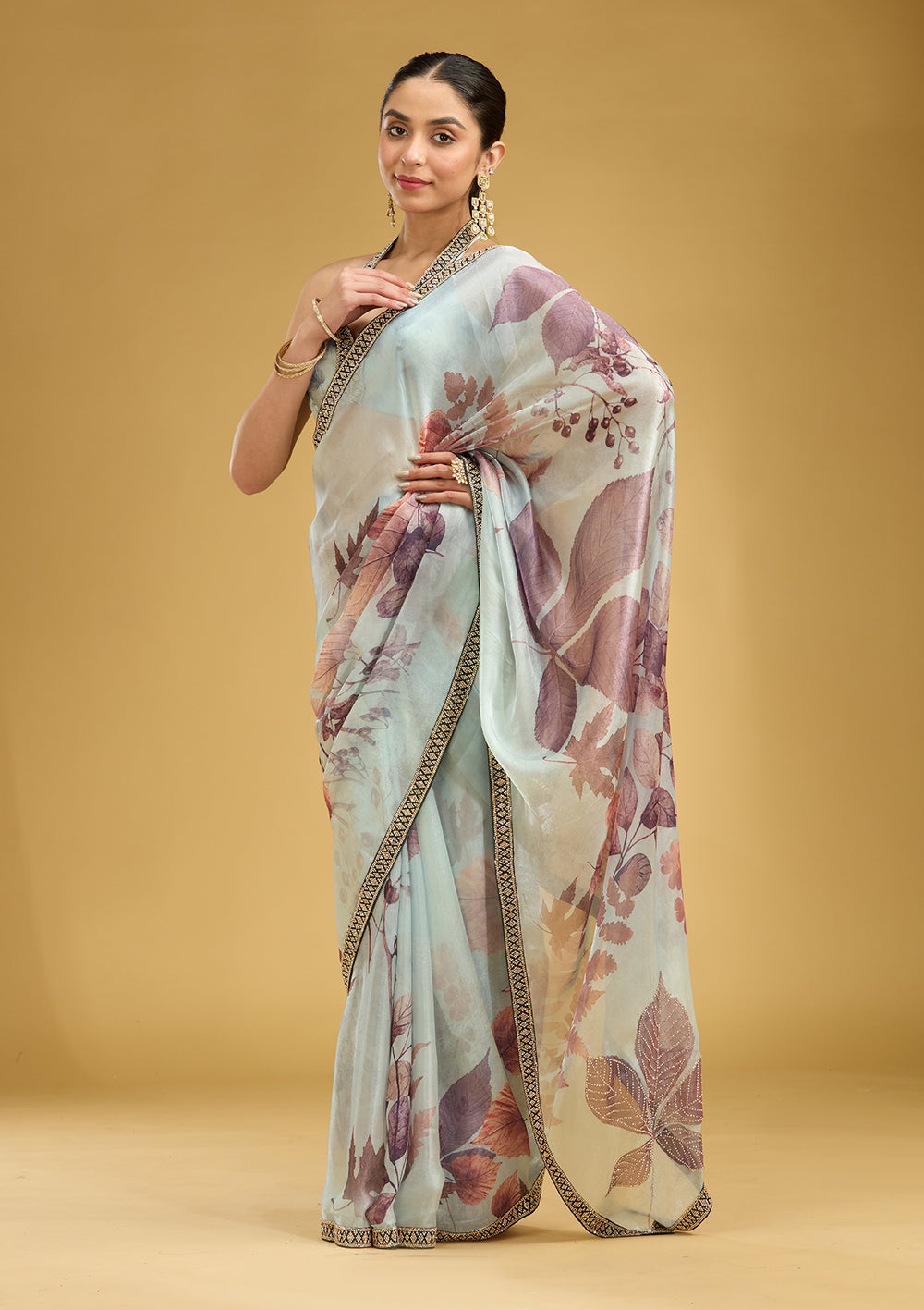 Sky Blue Saree in Chiffon fabric. The Saree is elevated with Stonework (Gold) embroidery. It comes with an Unstitched blouse. Comes with the Koskii promise of premium quality.
