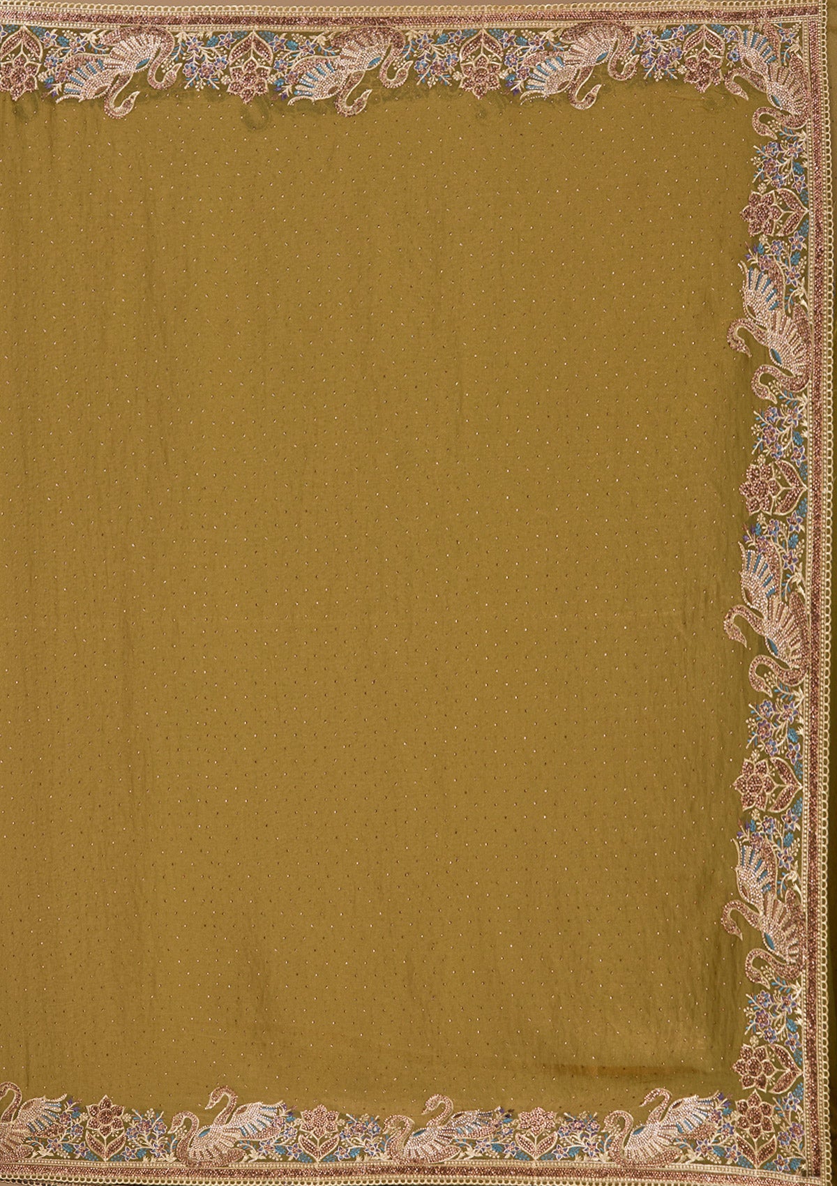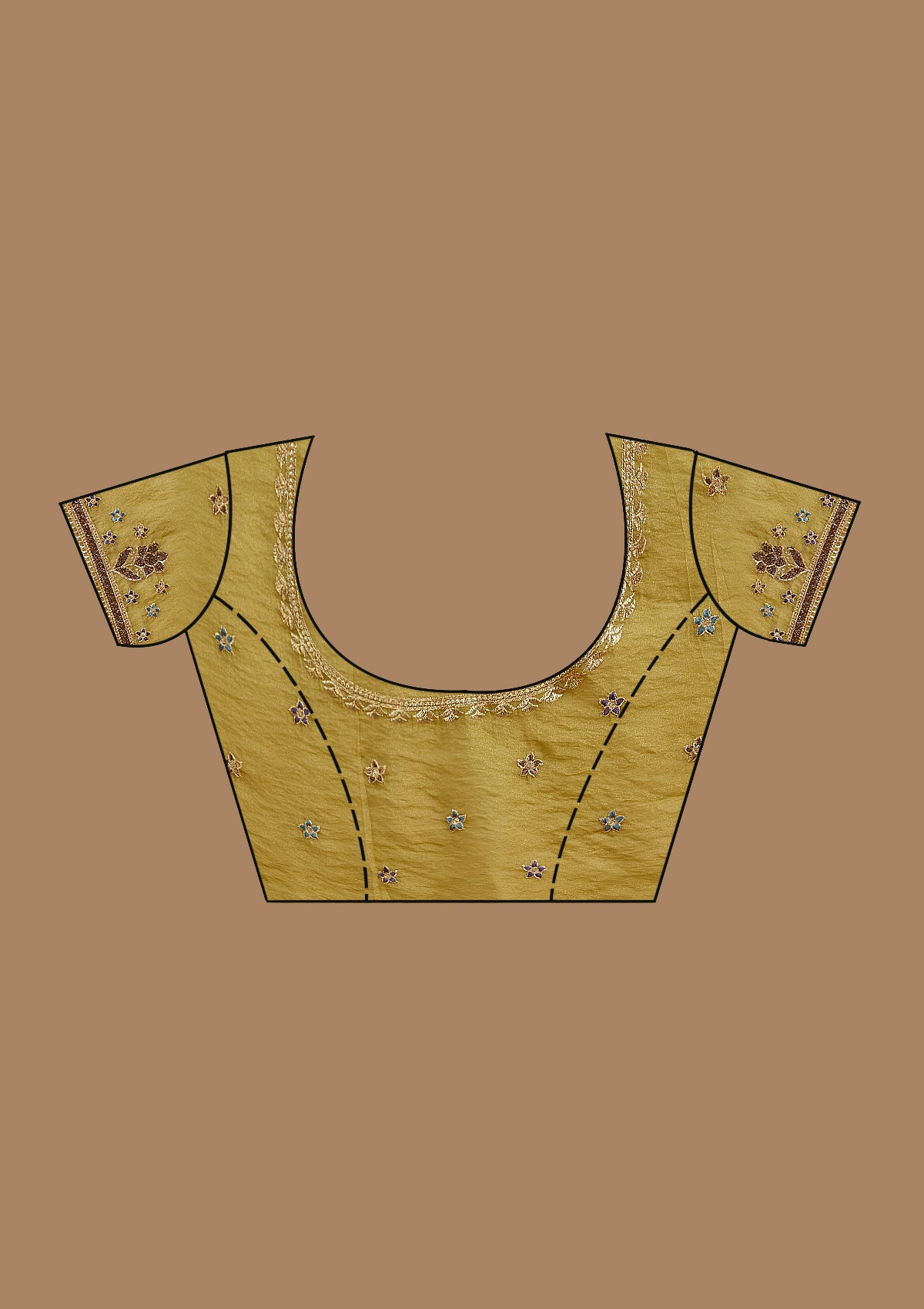 Pista Green Saree in Tissue fabric. The Saree is elevated with Stonework (Gold) embroidery. It comes with an Unstitched blouse. Comes with the Koskii promise of premium quality.