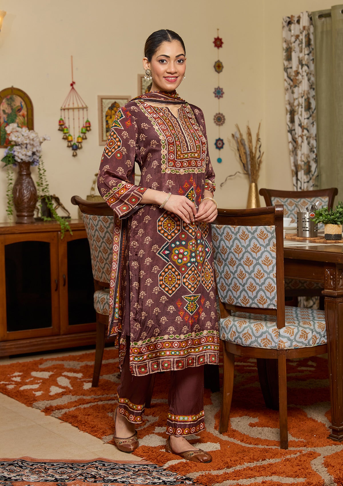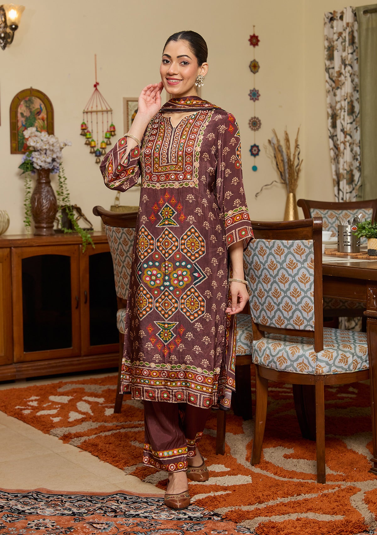 Brown Salwar Suit in Crepe fabric. The Salwar Suit is embellished with Mirrorwork embroidery. Accompanied with a bottom and dupatta. Comes with the Koskii promise of premium quality.