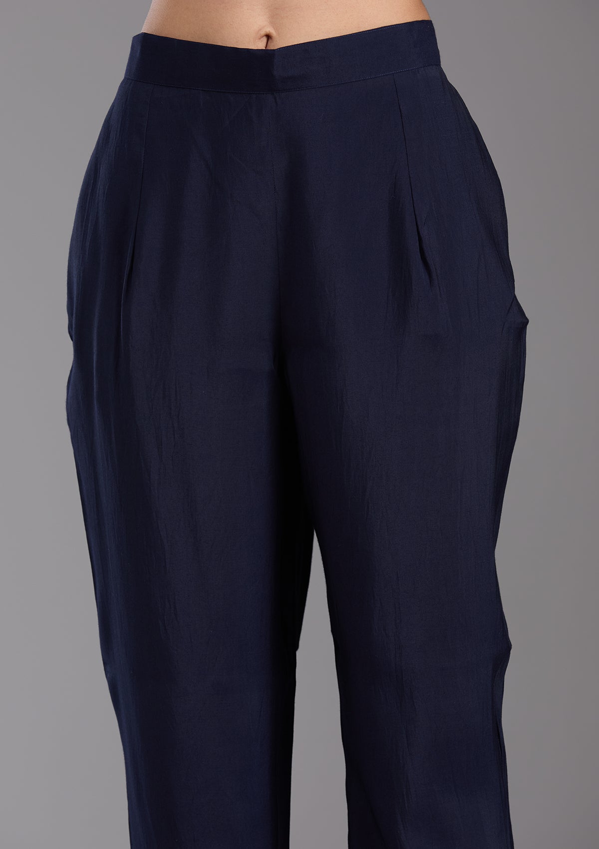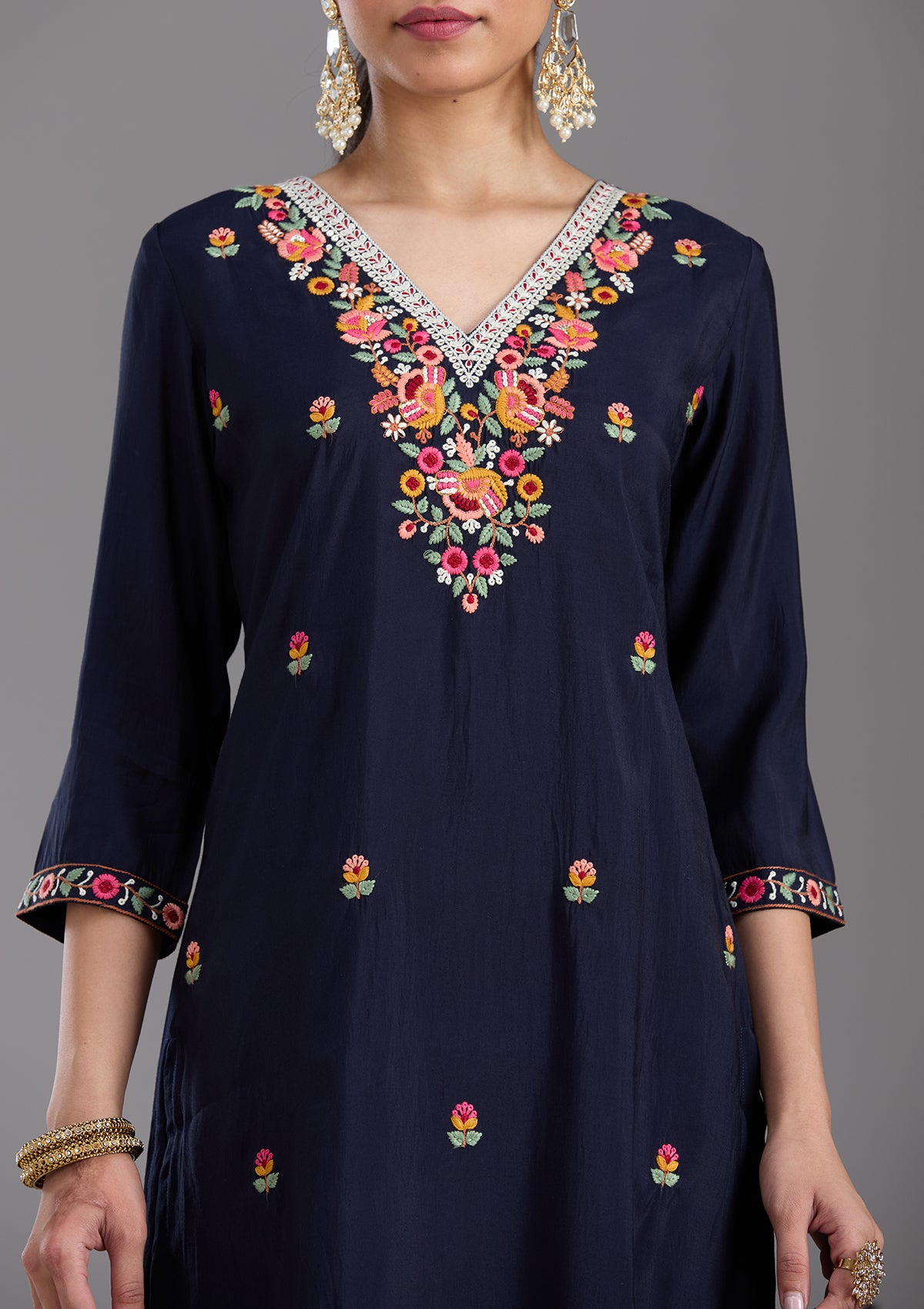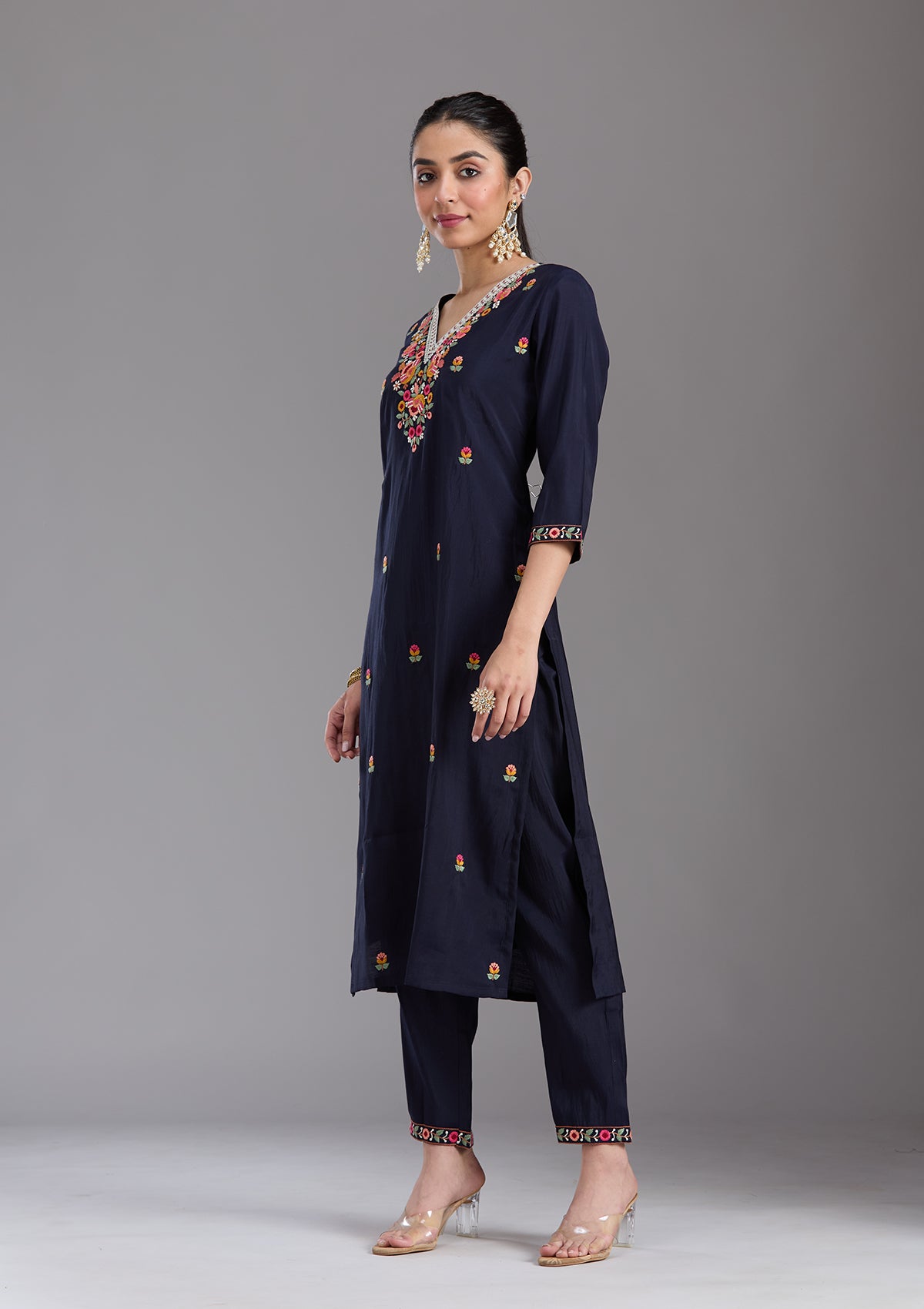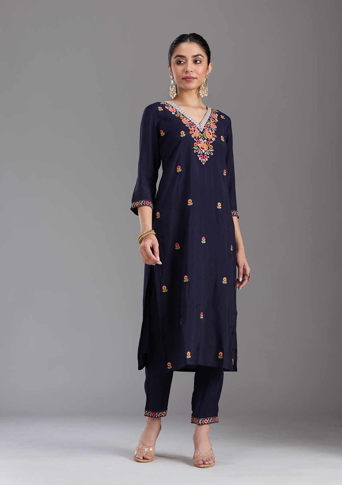 Navy Blue Salwar Suit in Chanderi fabric. The Salwar Suit is embellished with Threadwork embroidery. Accompanied with a bottom and dupatta. Comes with the Koskii promise of premium quality.