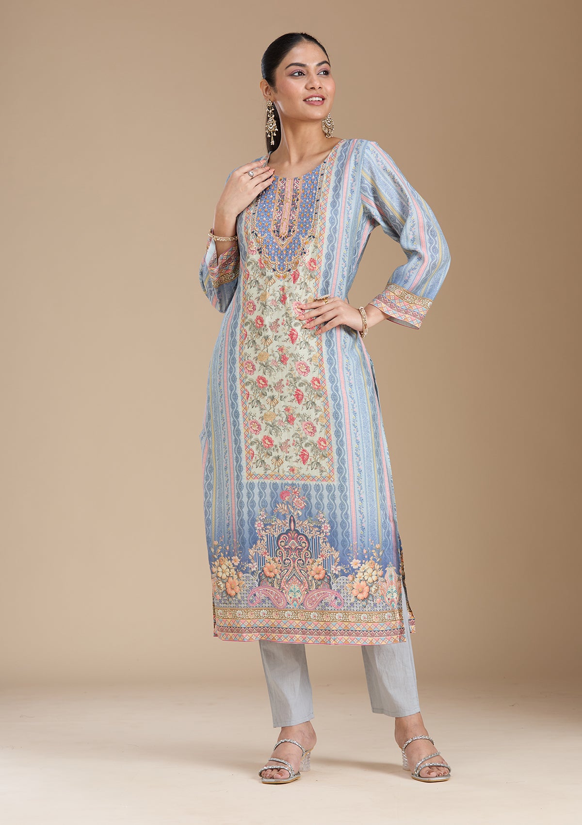 Sky Blue Salwar Suit in Crepe fabric. The Salwar Suit is embellished with Printed embroidery. Accompanied with a bottom and dupatta. Comes with the Koskii promise of premium quality.