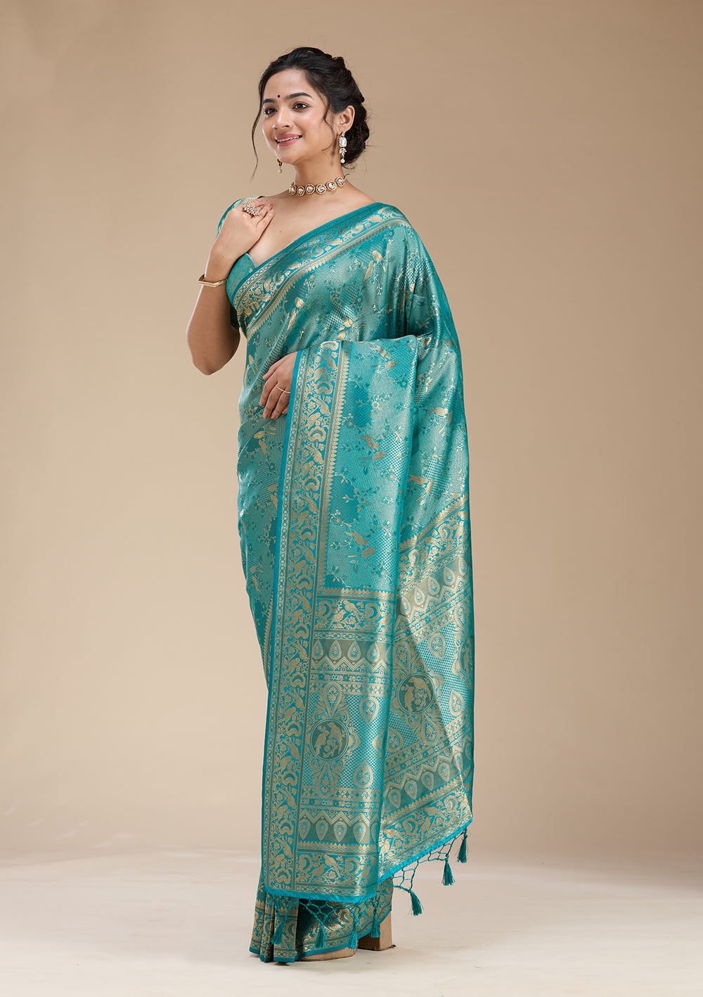 Peacock Green Saree in Silk fabric. The Silk Saree is elevated with Banarasi embroidery. It comes with an Unstitched blouse. Comes with the Koskii promise of premium quality.