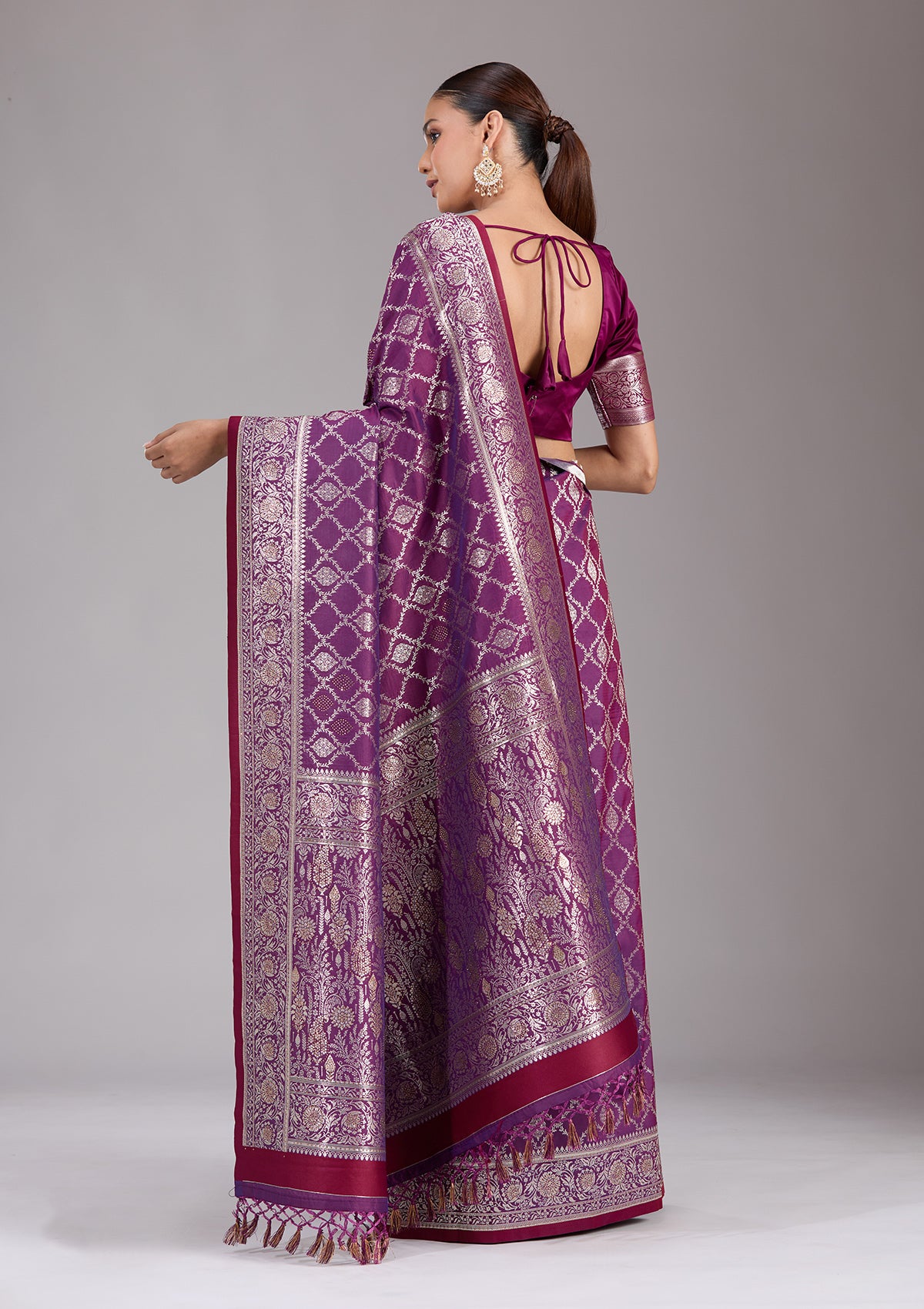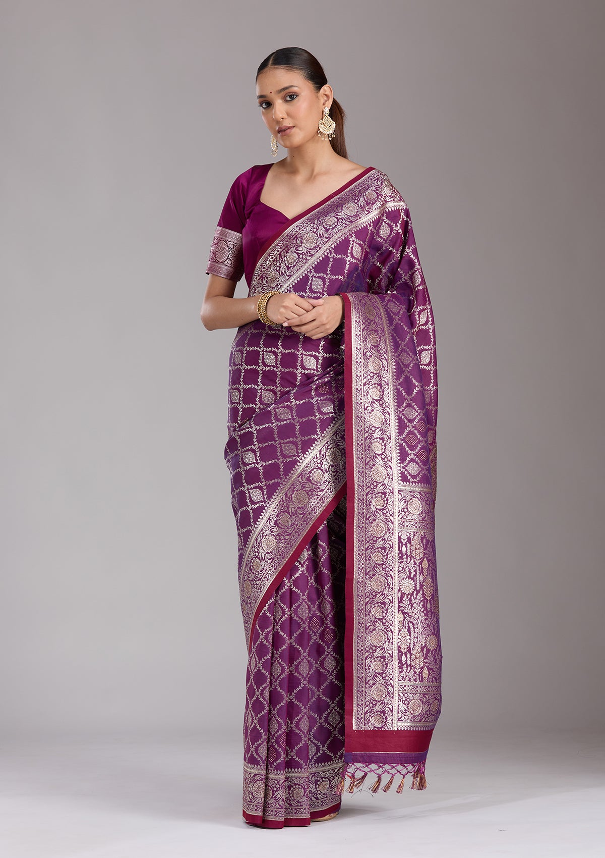 Purple Silk_Saree in Silk fabric. The Silk_Saree is elevated with Stonework (Gold) embroidery. It comes with an Unstitched blouse. Comes with the Koskii promise of premium quality.