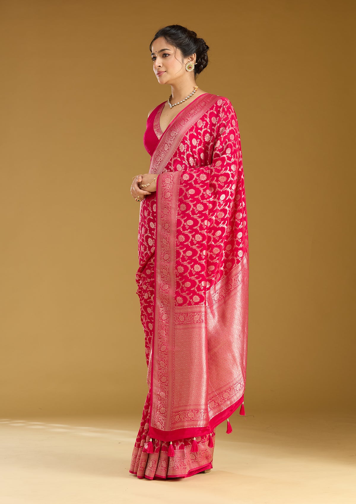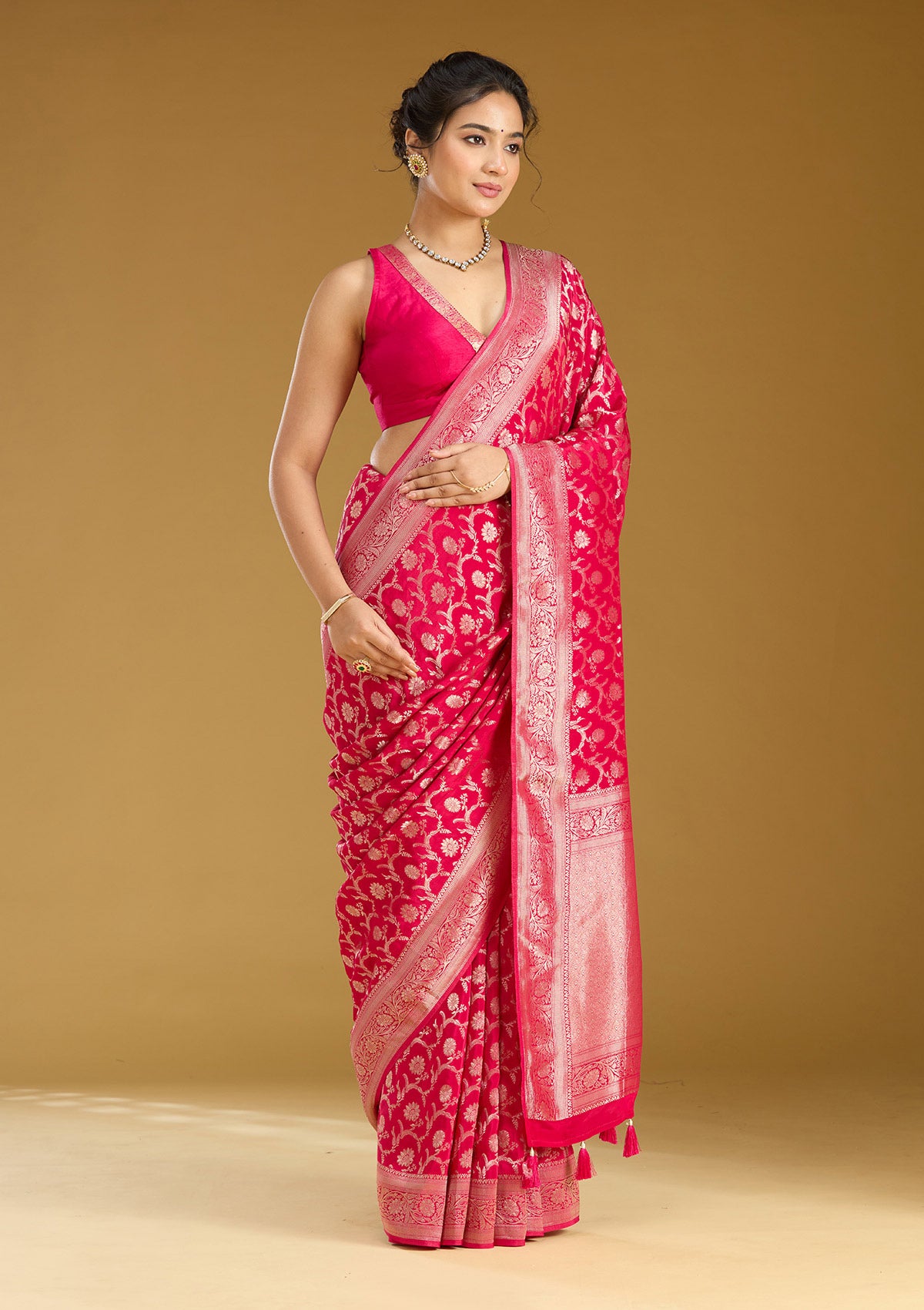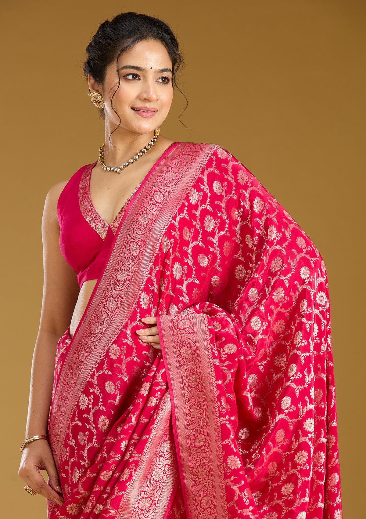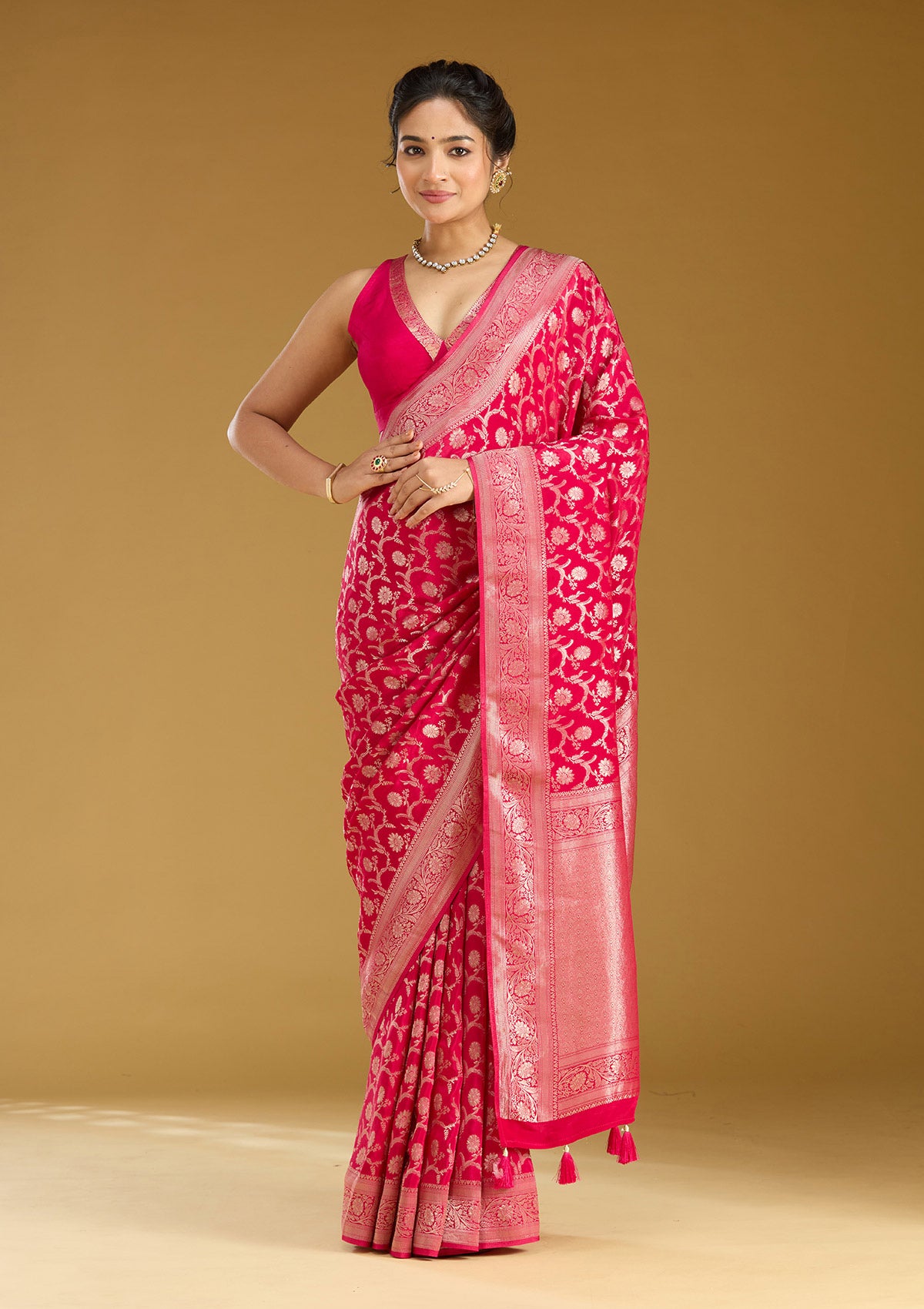Rani Pink Silk_Saree in Silk fabric. The Silk_Saree is elevated with Zariwork (Gold) embroidery. It comes with an Unstitched blouse. Comes with the Koskii promise of premium quality.