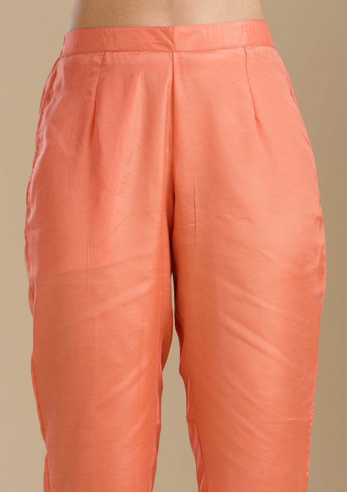 Light Orange Salwar Suit in Organza fabric. The Salwar Suit is embellished with Zardozi (Gold) embroidery. Accompanied with a bottom and dupatta. Comes with the Koskii promise of premium quality.