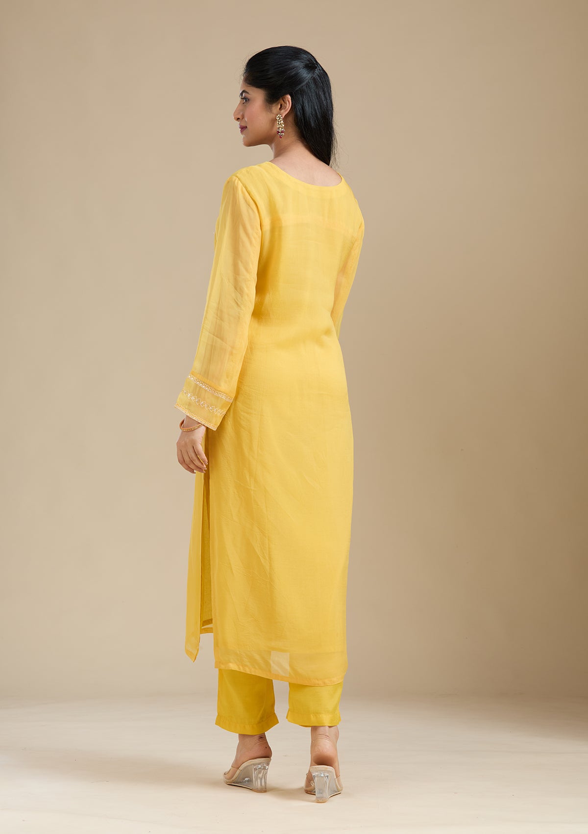 Mustard Yellow Salwar Suit in Organza fabric. The Salwar Suit is embellished with Zardozi (Gold) embroidery. Accompanied with a bottom and dupatta. Comes with the Koskii promise of premium quality.