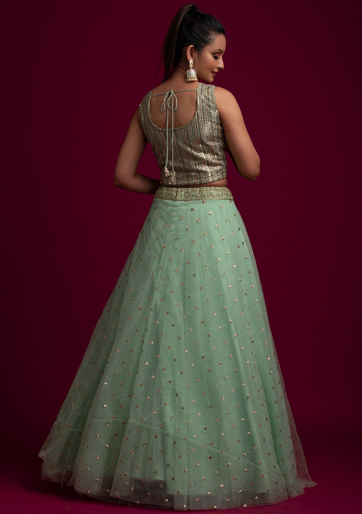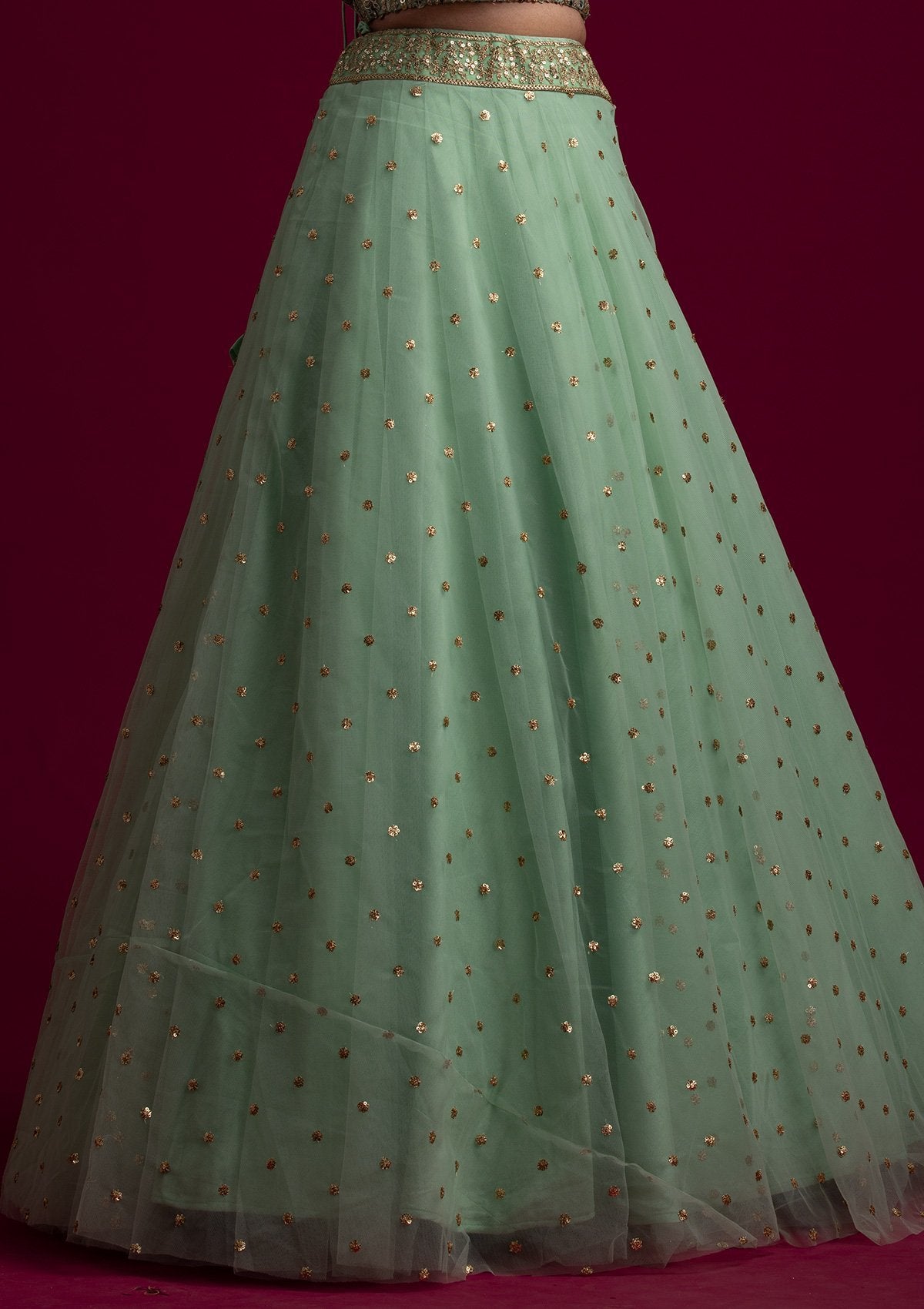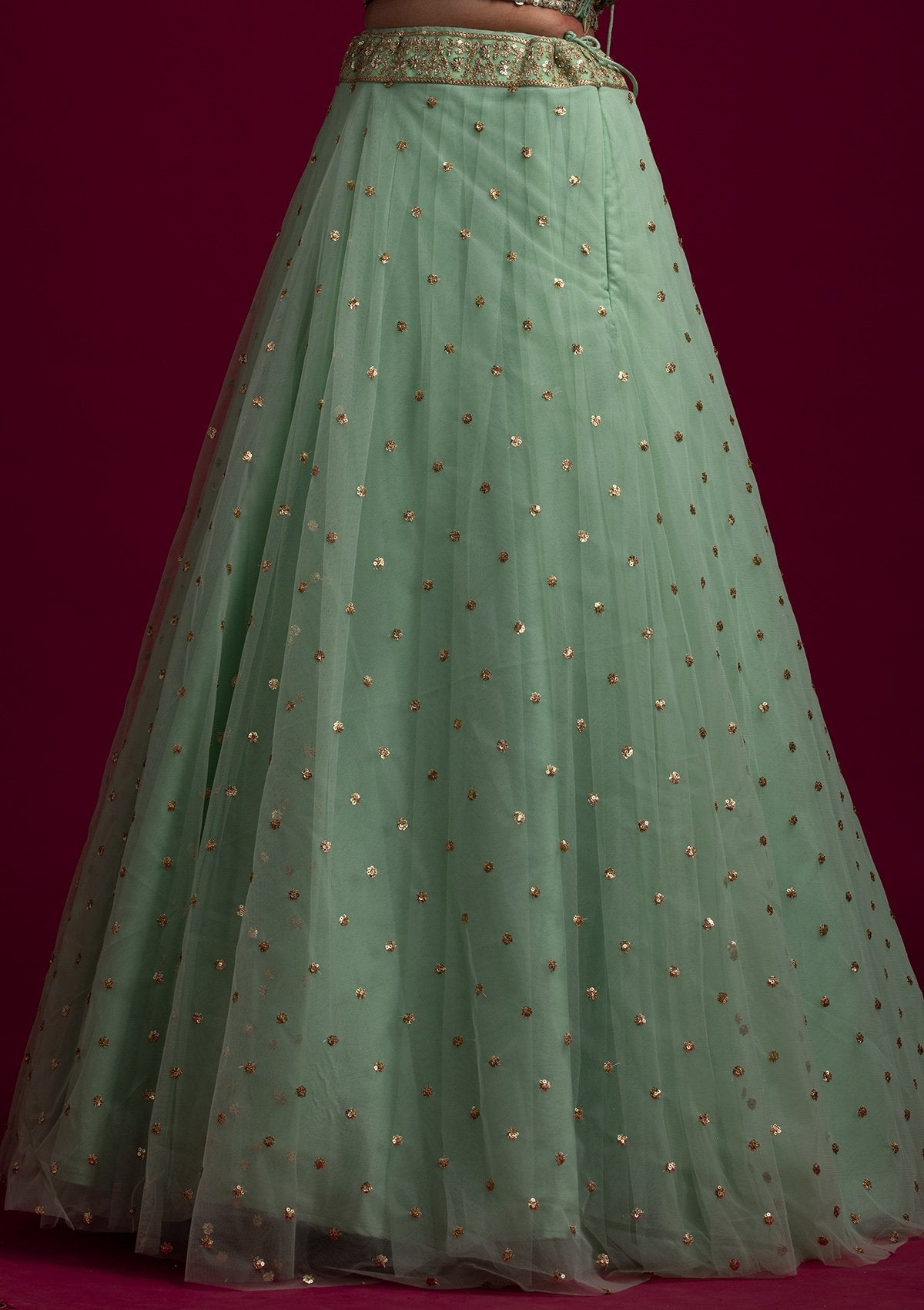 Pista Green Readymade Lehenga In Net. Embellished With Sequins Embroidery. Paired With A Blouse With Sequins Embroidery. Enhanced With A Pista Green Net Dupatta.