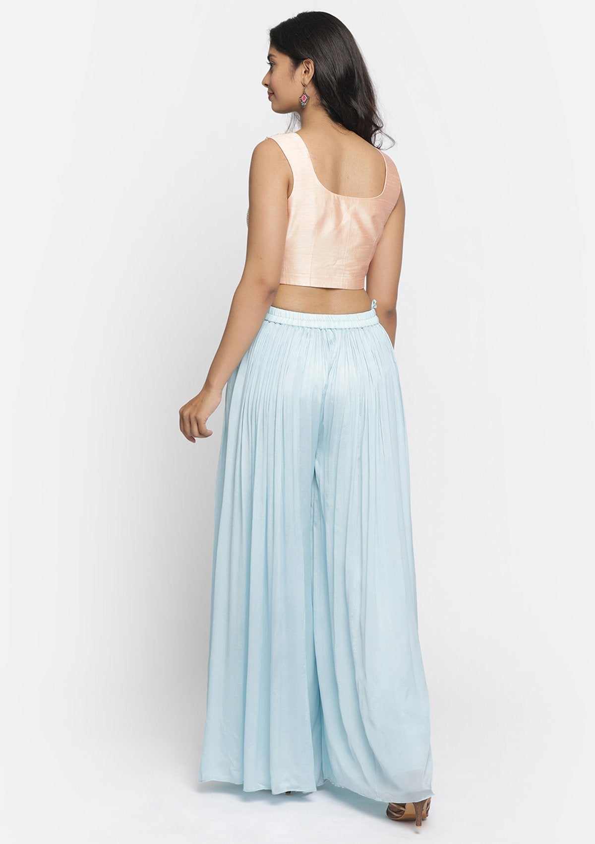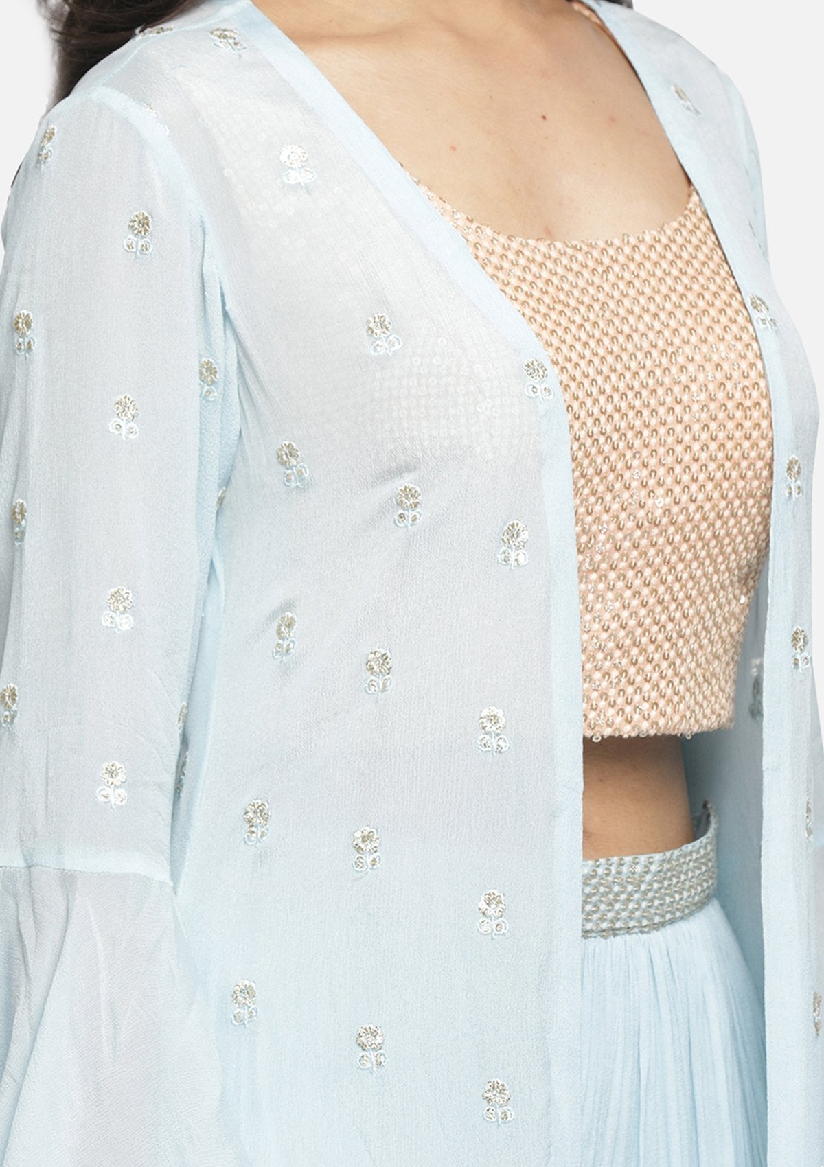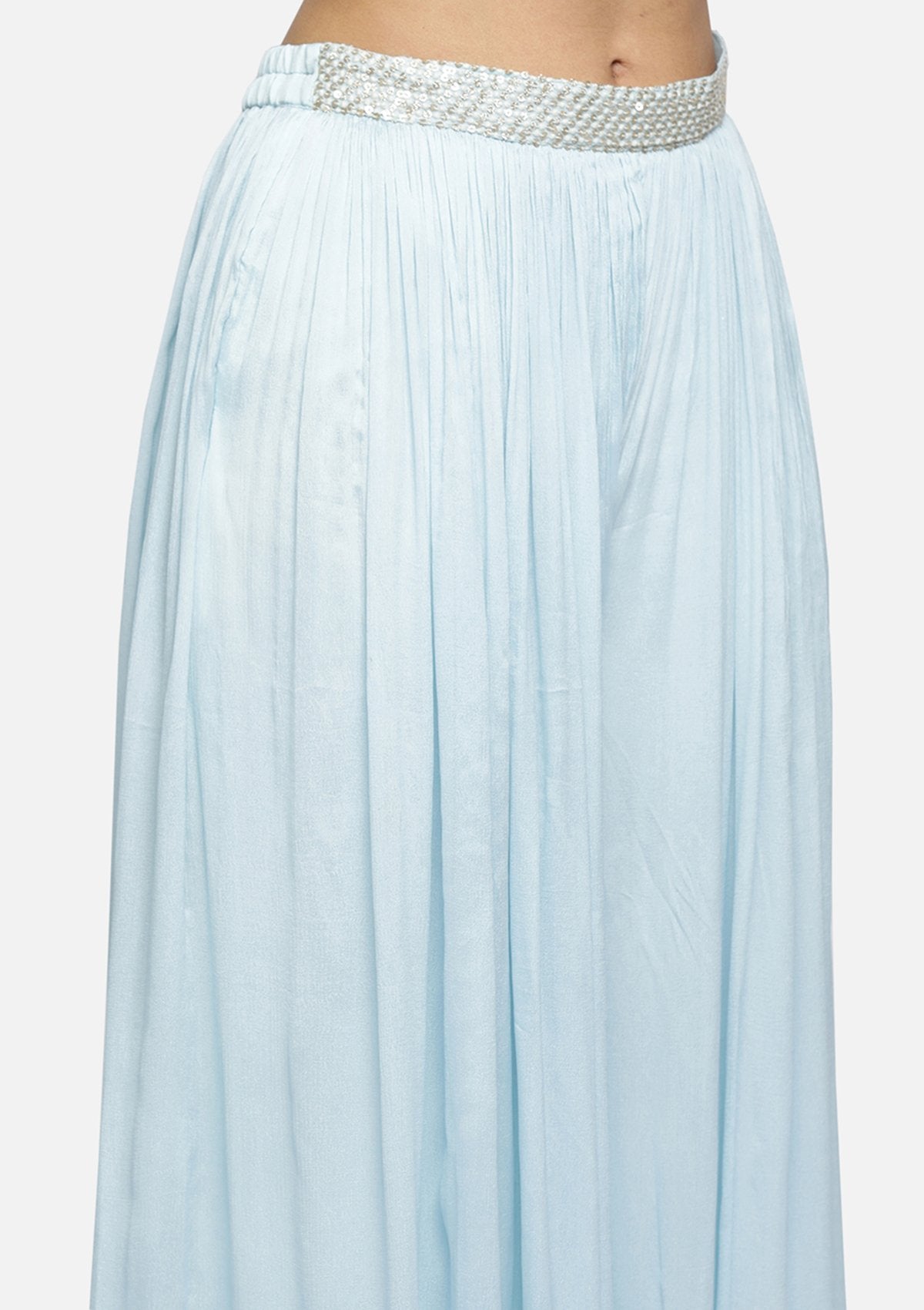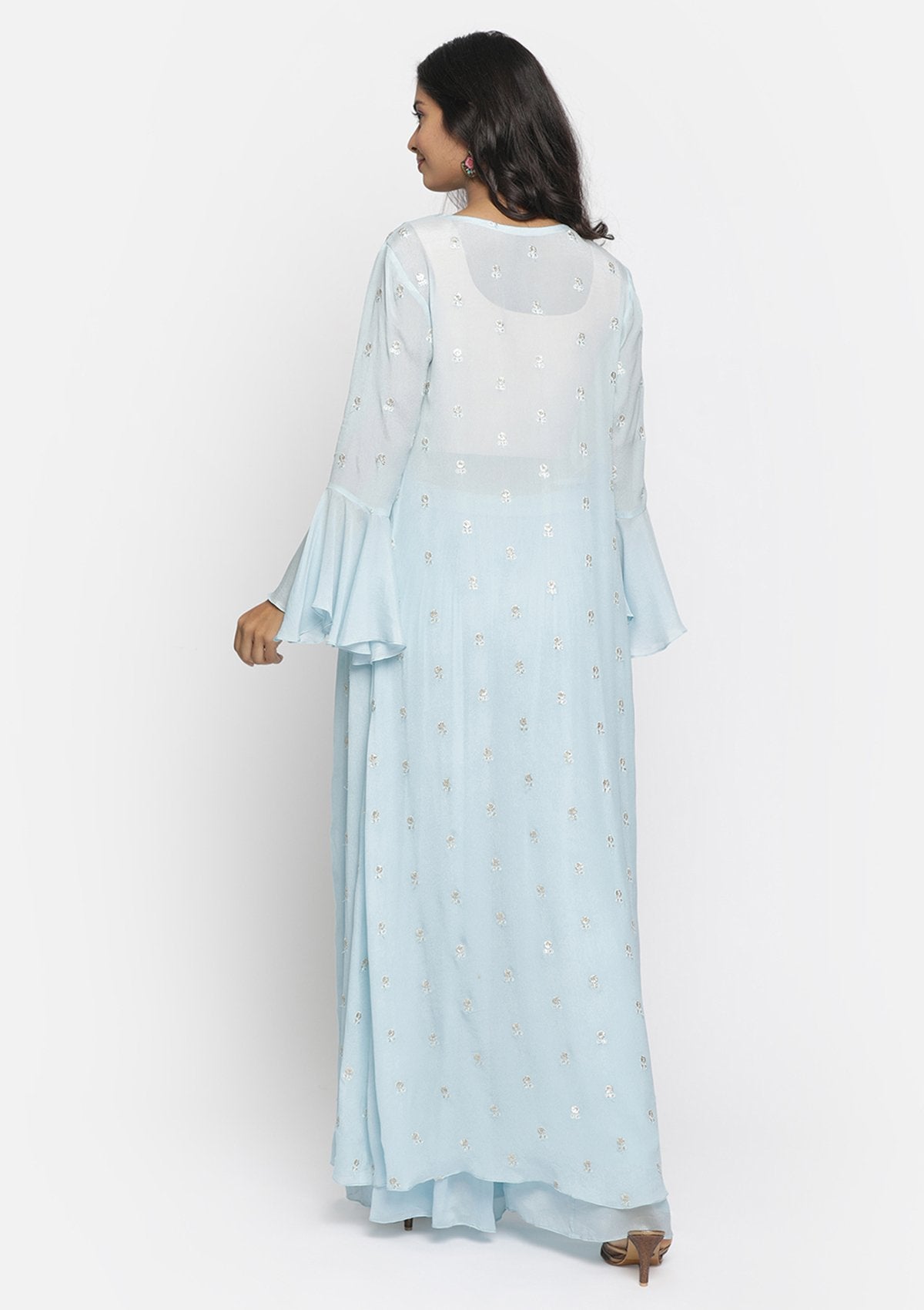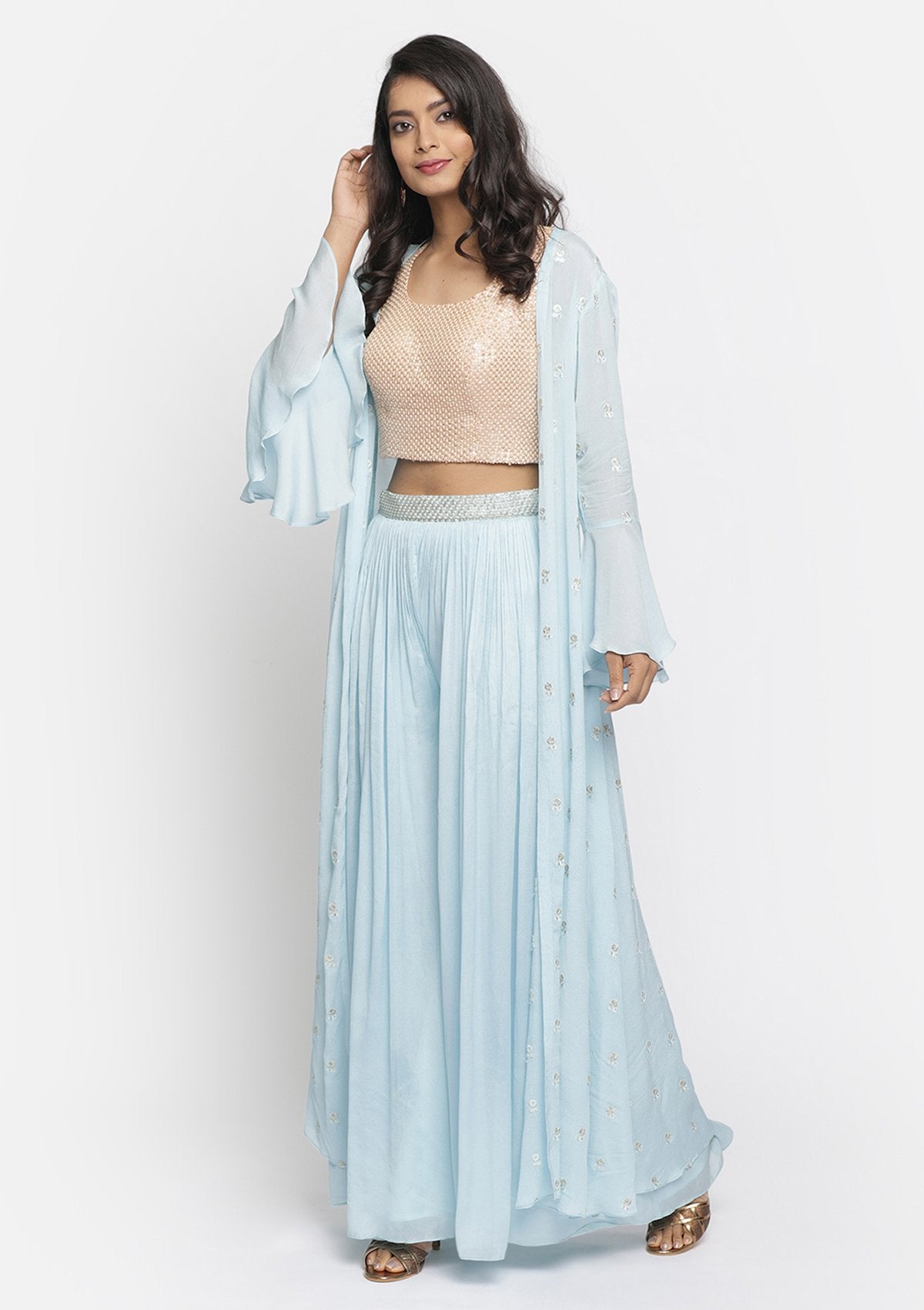 Sky Blue Salwar suit tailored in Semi Crepe fabric. Elevated with Sequins Embroidery. The Salwar Suit Is Accompanied With A Bottom. Comes with the Koskii promise of premium quality.