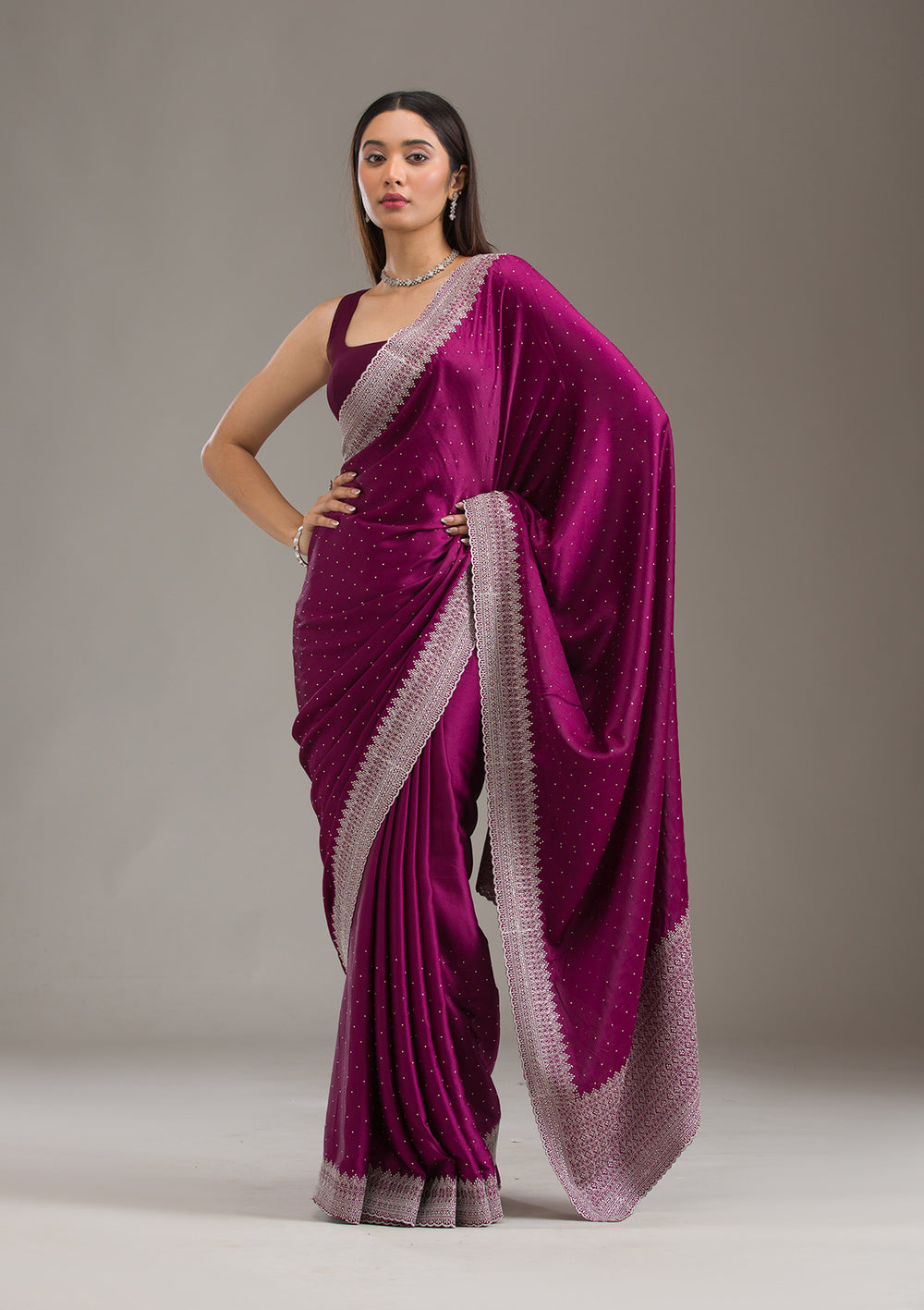 Embrace the epitome of vibrant elegance with Koskii's radiant purple satin saree, adorned with captivating silver zariwork that dances along the fabric like a sequence of sparkling stars. This saree is your perfect pick for making a bold statement at any evening event, wrapping you in a world of luxurious texture and scintillating design. Let the party begin around you, with Koskii's saree as your glamorous armor!.