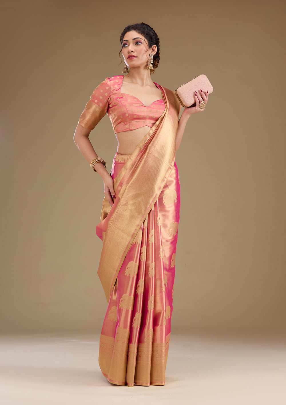 Dive into the luxurious embrace of Koskii’s Gold Silk Saree, where fine art meets fabric in a dance of elegance! Each thread of this radiant saree is woven with vibrant zari embroidery, promising not just a garment but a grand statement of style and tradition. Perfect for the woman who loves to enliven every gathering with her spirited presence and impeccable taste.