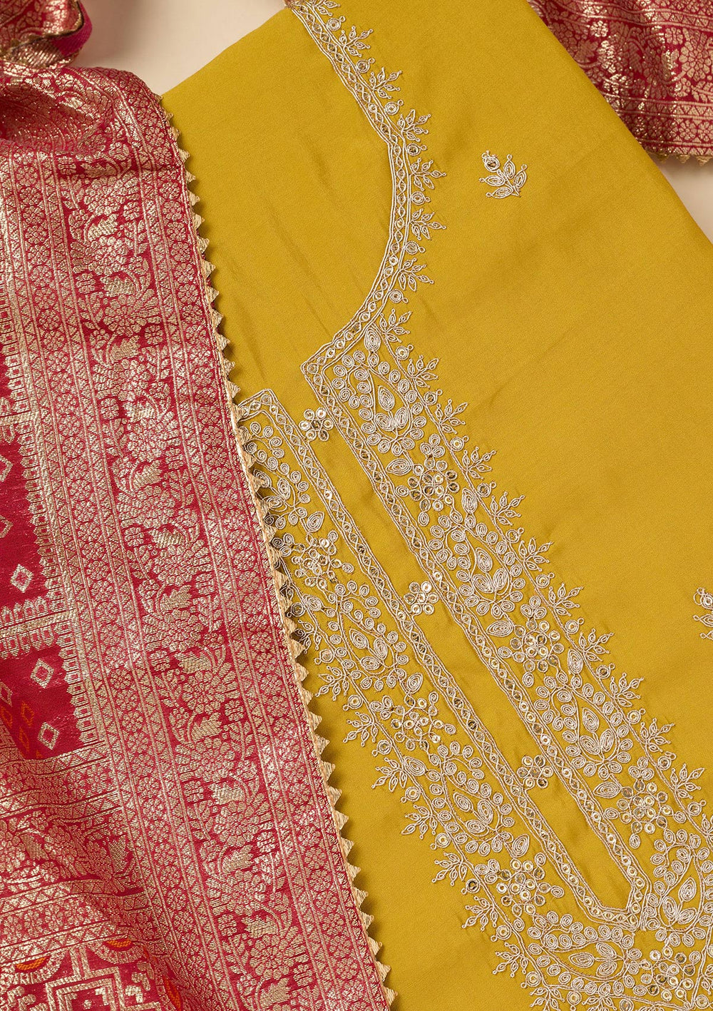 Yellow Zariwork Soft Raw Silk Unstitched Salwar Suit