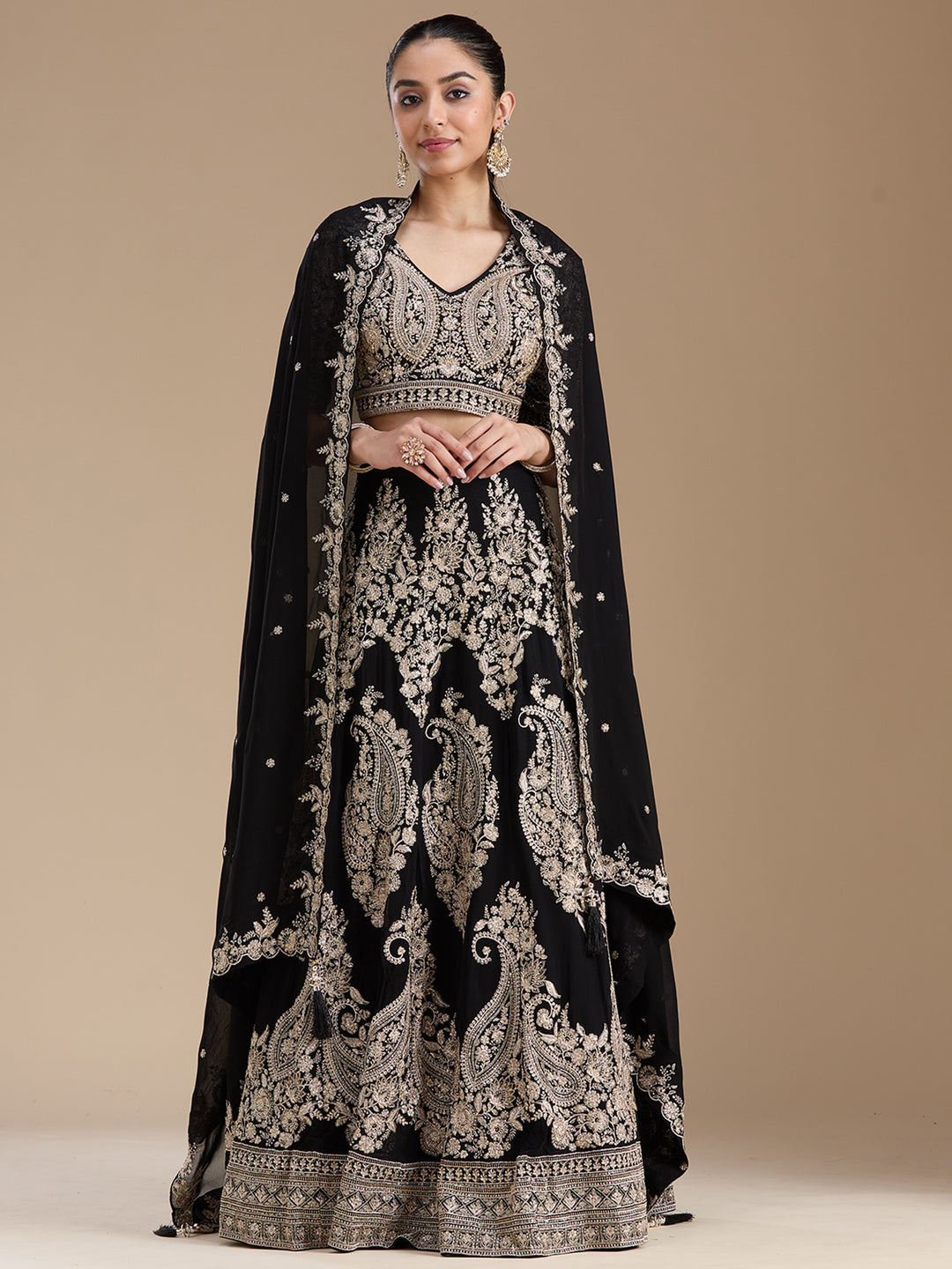 Unleash your vibrancy with Koskii's stunning black satin Anarkali gown, where elegance meets spirited charm! This exquisitely crafted piece features dazzling stonework on the bodice and sleeves, offering a radiant sparkle that catches every light. Perfect for an evening where you wish to stand out, this gown swirls with every step, celebrating bold, playful expressions and Koskii's promise of timeless beauty.
