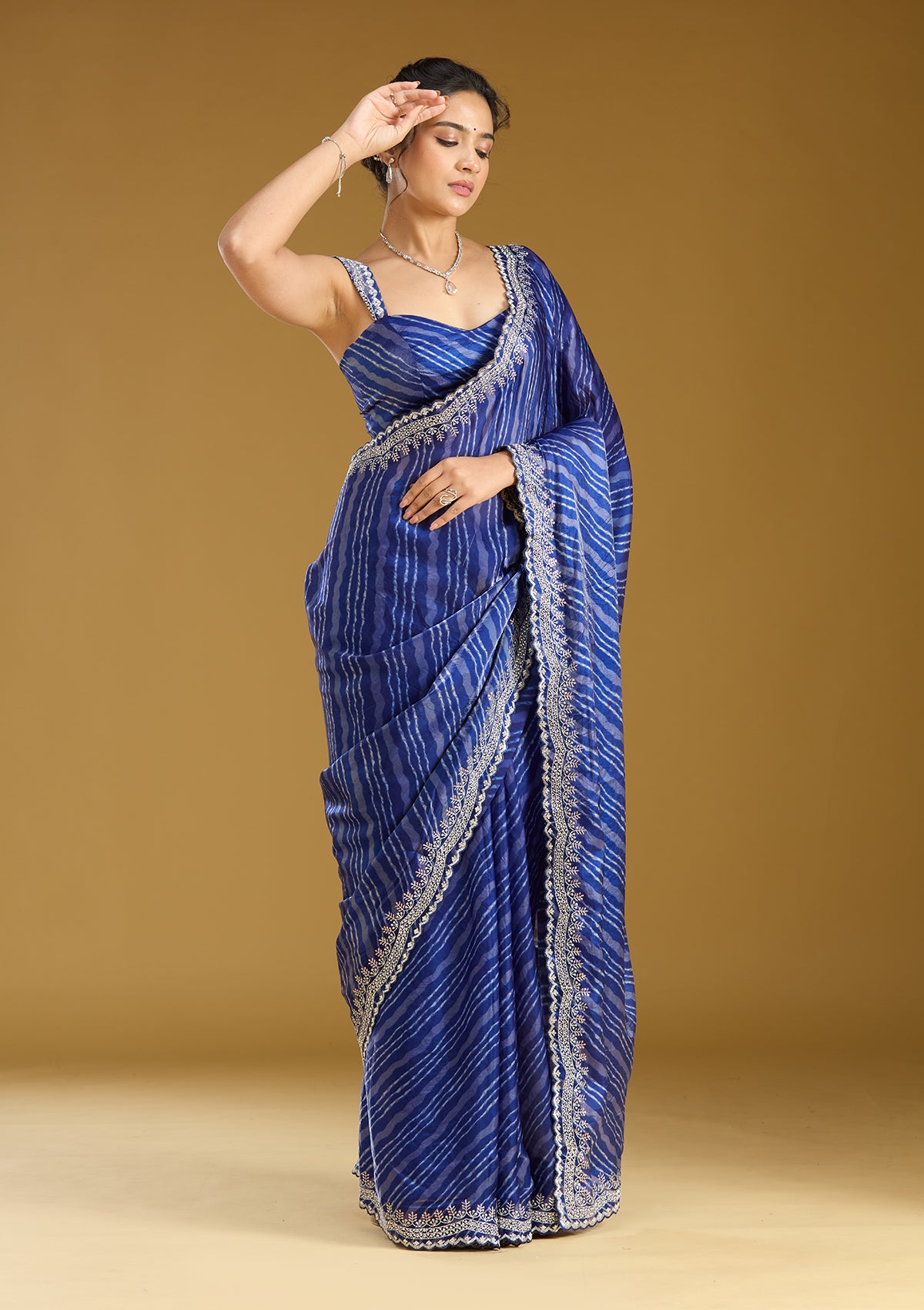 Navy Blue Saree in Organza fabric. The Saree is elevated with Zariwork (Silver) embroidery. It comes with an Unstitched blouse. Comes with the Koskii promise of premium quality.