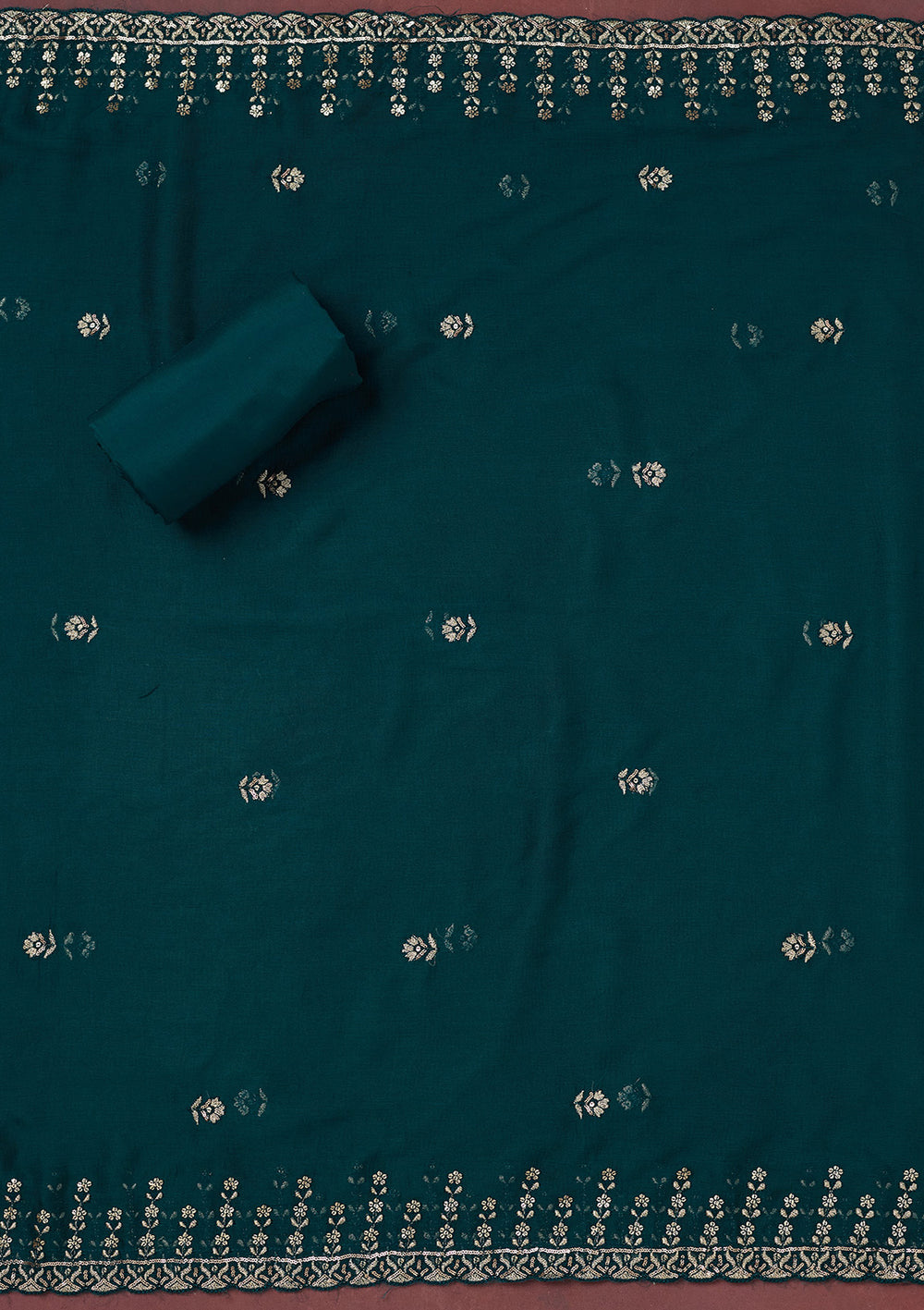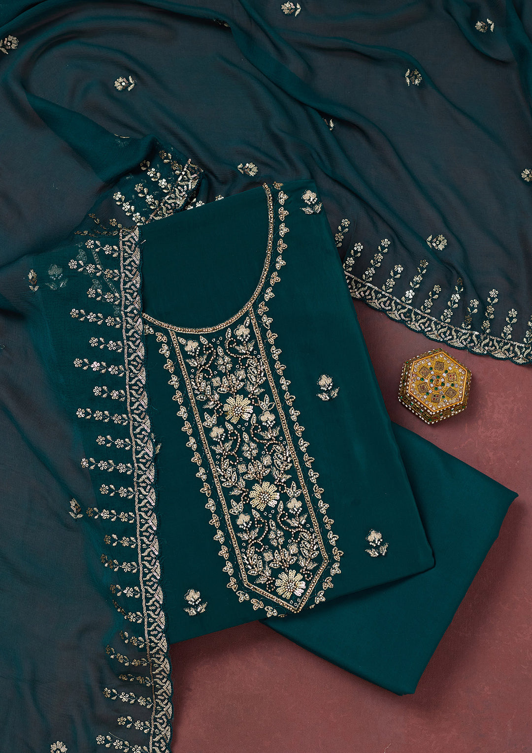 | Peacock Blue Zariwork (Gold) Chinon Unstitched Salwar Suit | ₹ 3,592 | |