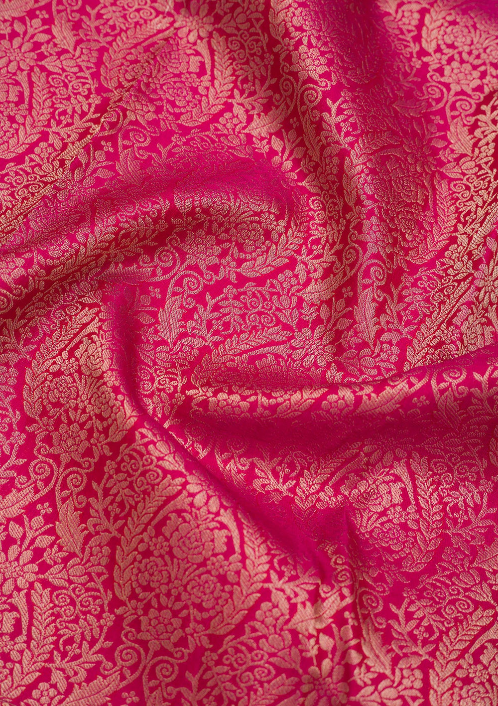 Rani Pink Saree in Pure Silk fabric. The Saree is elevated with Zariwork embroidery. It comes with an Unstitched blouse. Comes with the Indian Silk Mark certification.