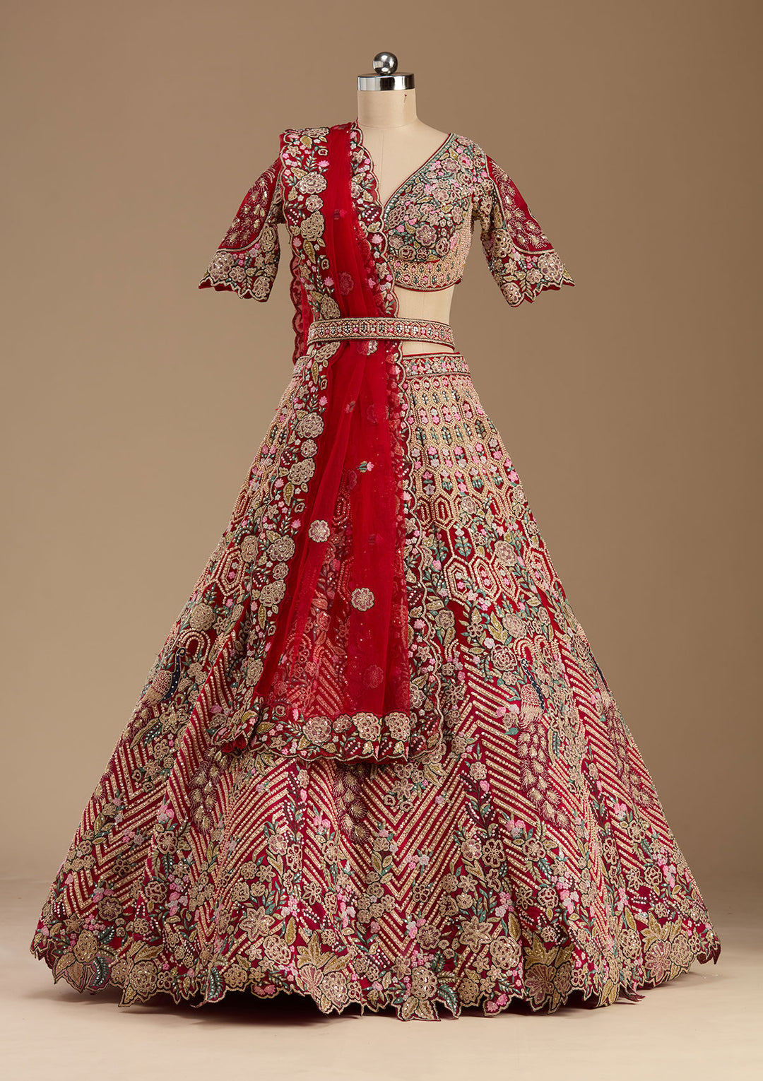 - Traditional and Classic: Opt for a traditional red or maroon lehenga that is heavily embellished with intricate gold embroidery. Add a matching dupatta with a detailed border. Materials such as silk, velvet, or net will add to the opulence.