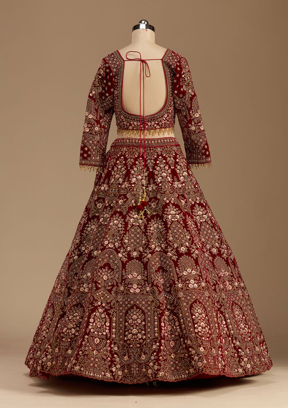 - Heavy Work Wedding Lehengas: Koskii’s heavy-work lehengas for wedding parties will surely bring a royal vibe to your special night. Deck up in a cutdana heavy velvet lehenga and make your groom and guests speechless with your enchanting appeal. A heavy-work maroon bridal lehenga embellished with sequin, stone, mirror, and threadwork can add some extra oomph to your sensational appearance.