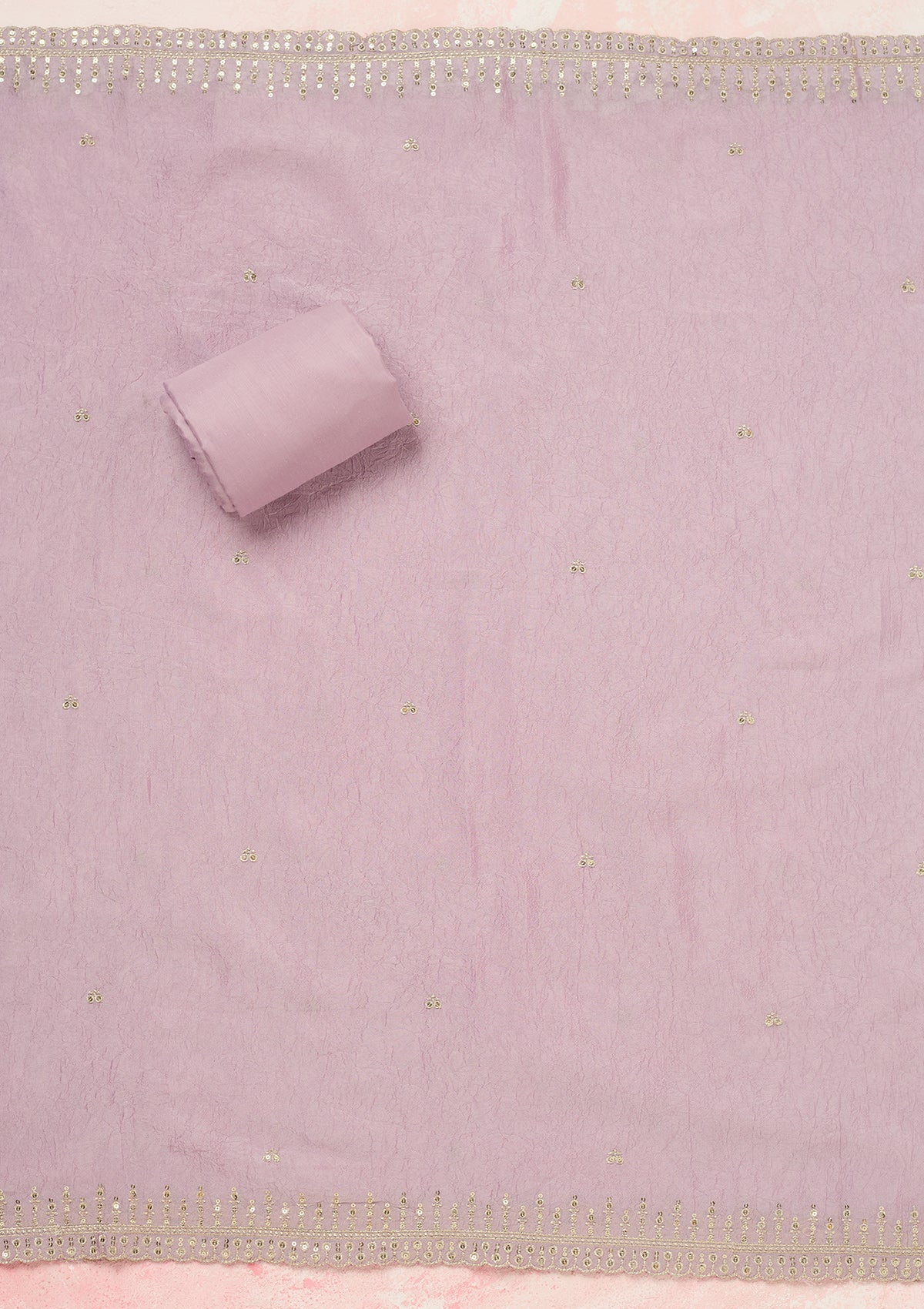 Lavender Salwar Suit in Chinon fabric. The Salwar Suit is embellished with Zariwork (Gold) embroidery. Accompanied with a bottom and dupatta. Comes with the Koskii promise of premium quality.