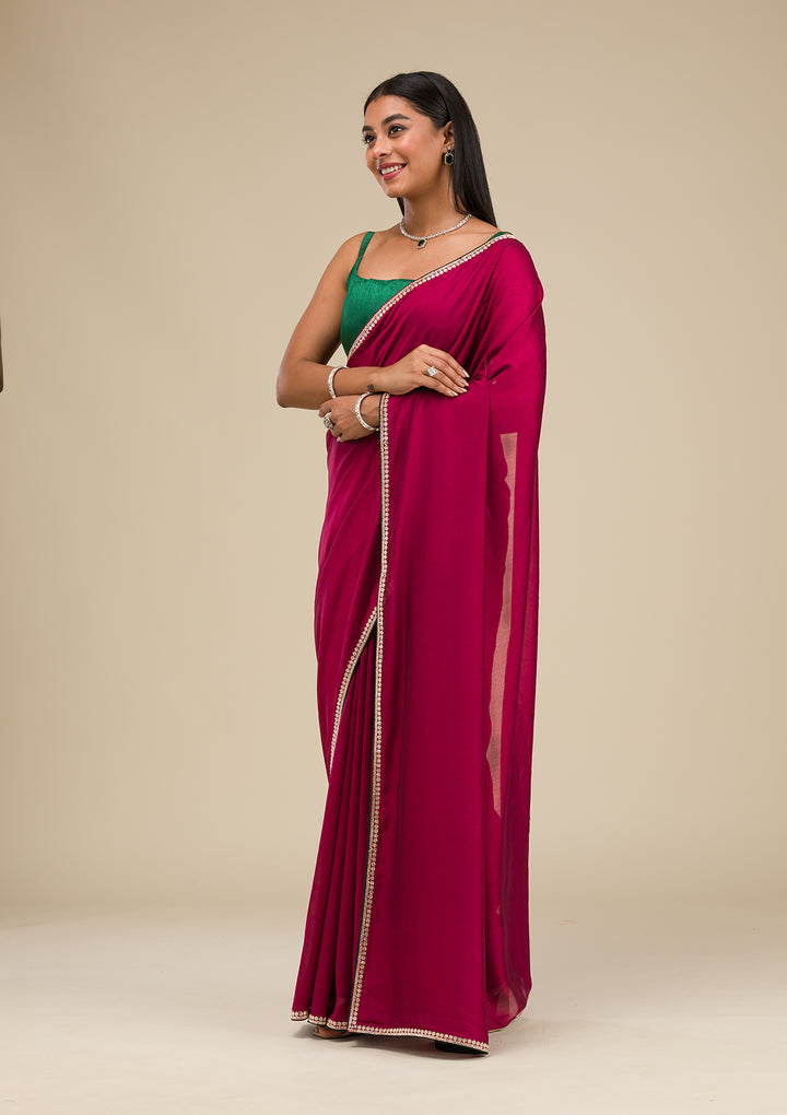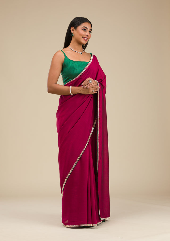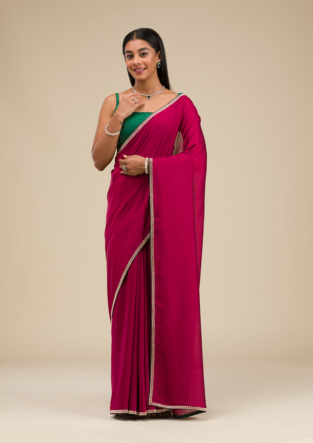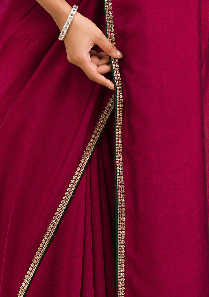 Unveil your vibrant side with Koskii's magenta soft raw silk saree, a testament to timeless elegance with a contemporary twist! This exquisite piece, adorned with shimmering gold stonework embroidery, fits seamlessly into any sophisticated wardrobe, promising a splash of spirited charm at your next gathering. Feel the luxurious touch of soft raw silk as it gracefully drapes, highlighting every move you make with an enchanting sparkle.