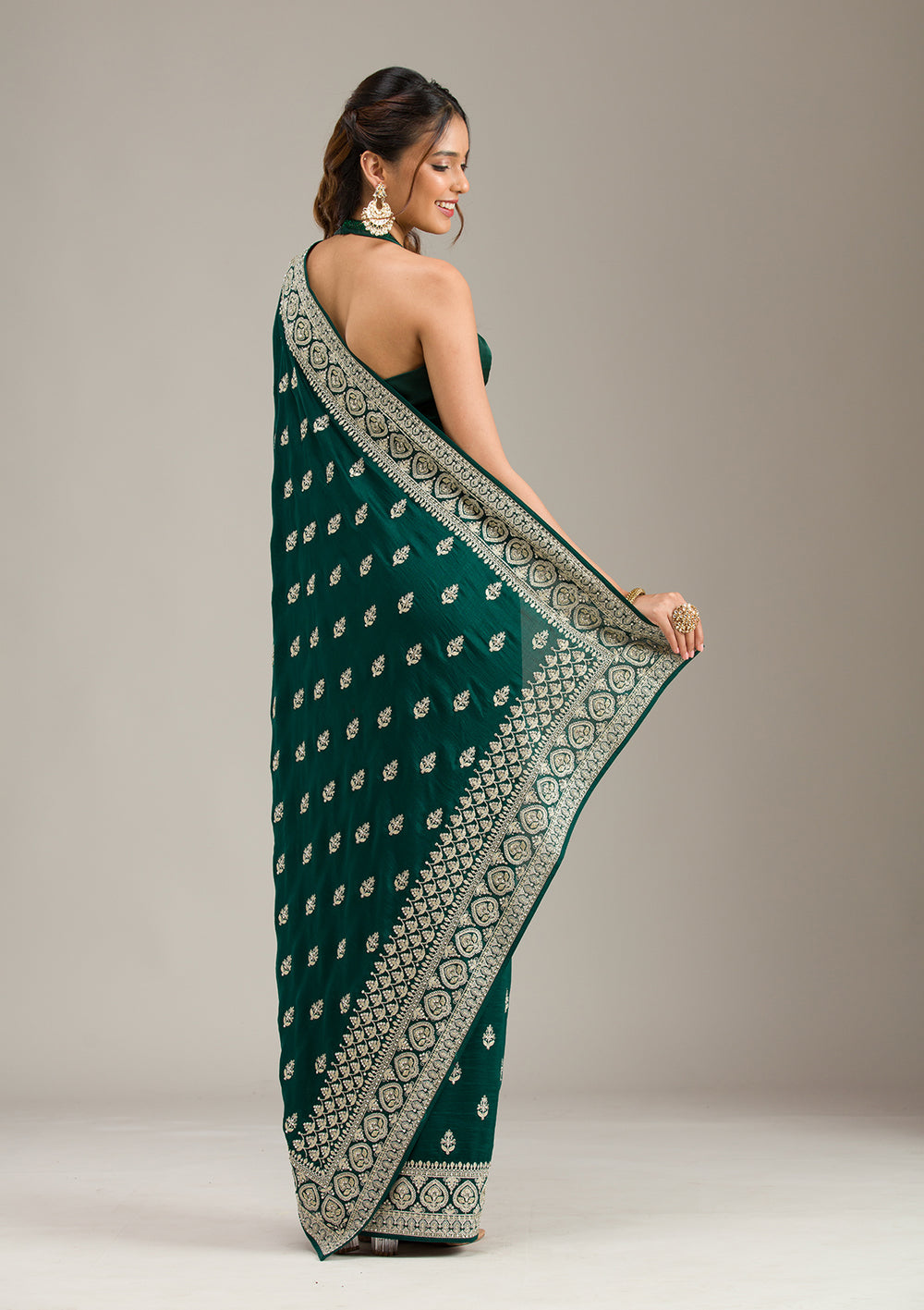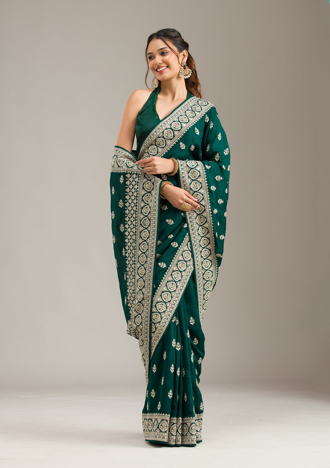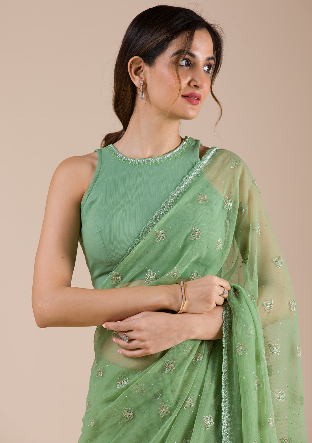 - Green chiffon saree work for both festive and formal occasions, bringing a fresh and vibrant touch to your attire. The soothing colour enhances your natural beauty and adds a touch of elegance.