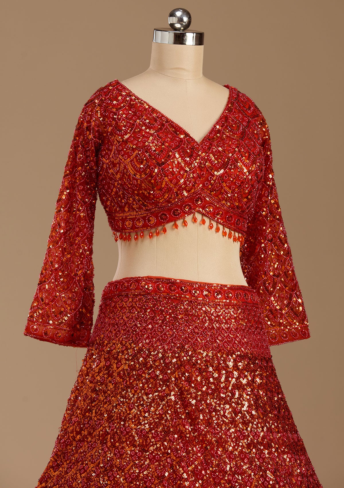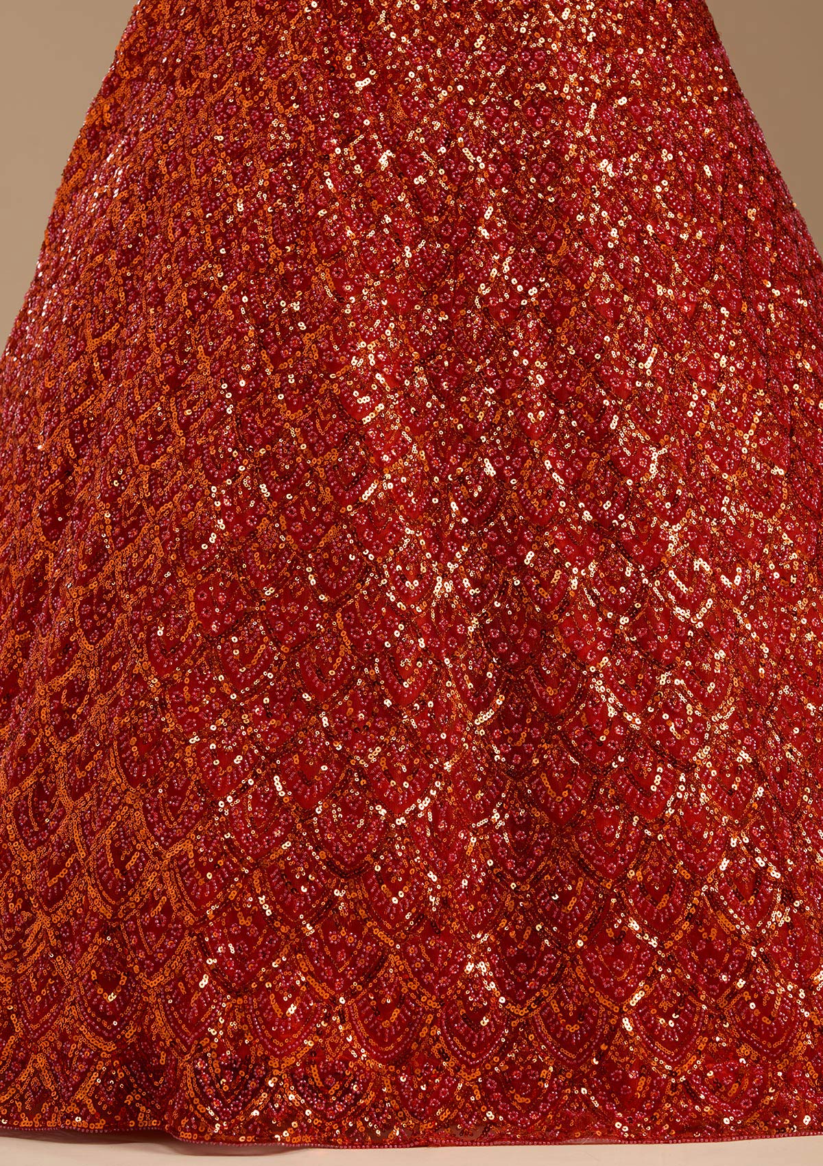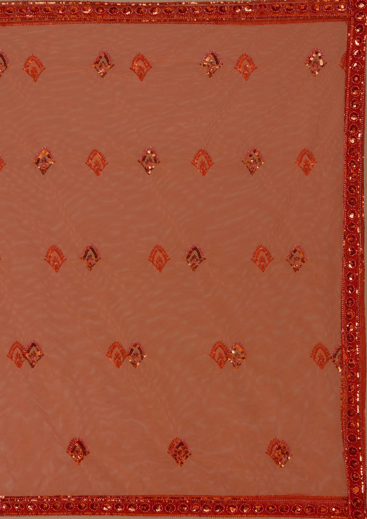 Orange Readymade Lehenga in Net fabric. The Lehenga is embellished with Sequins embroidery. Accompanied with an Readymade blouse and dupatta. Comes with the Koskii promise of premium quality.