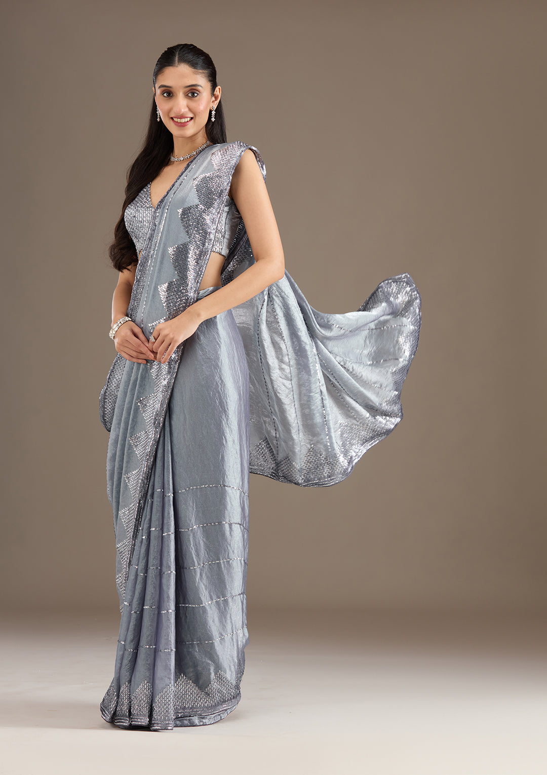 - Sensual Sarees: Set the party floor on fire with your appealing look in a sky-blue sequin saree from Koskii. Accessorise your ensemble with minimal makeup and statement jewellery for a dashing appeal.