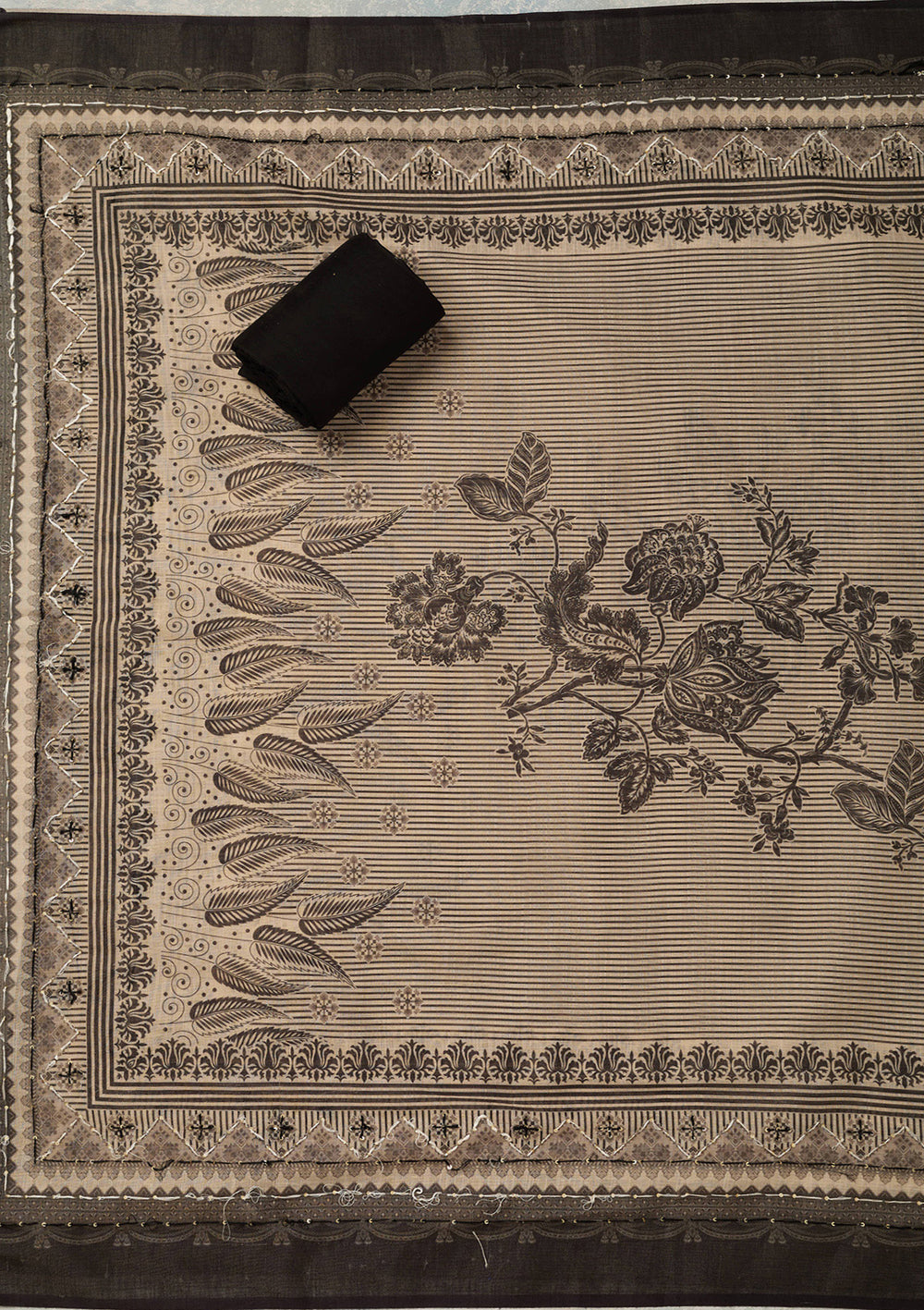 Beige Threadwork Chanderi Unstitched Salwar Suit