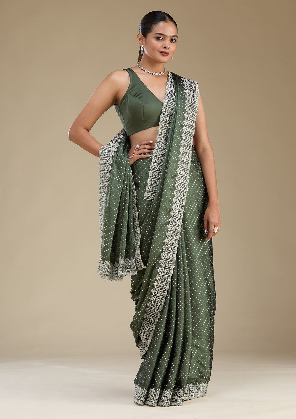 Wrap yourself in the luxurious embrace of Koskii’s stunning green Tissue saree, where traditional Zariwork dances in silver threads across a sea of exquisite fabric. This saree boasts a fluid grace and a whisper of playfulness, perfect for making an enchanting statement wherever you go. Revel in the craftsmanship and shine bright in this piece of sartorial elegance, designed to captivate and charm at any upscale soirée or evening gathering.