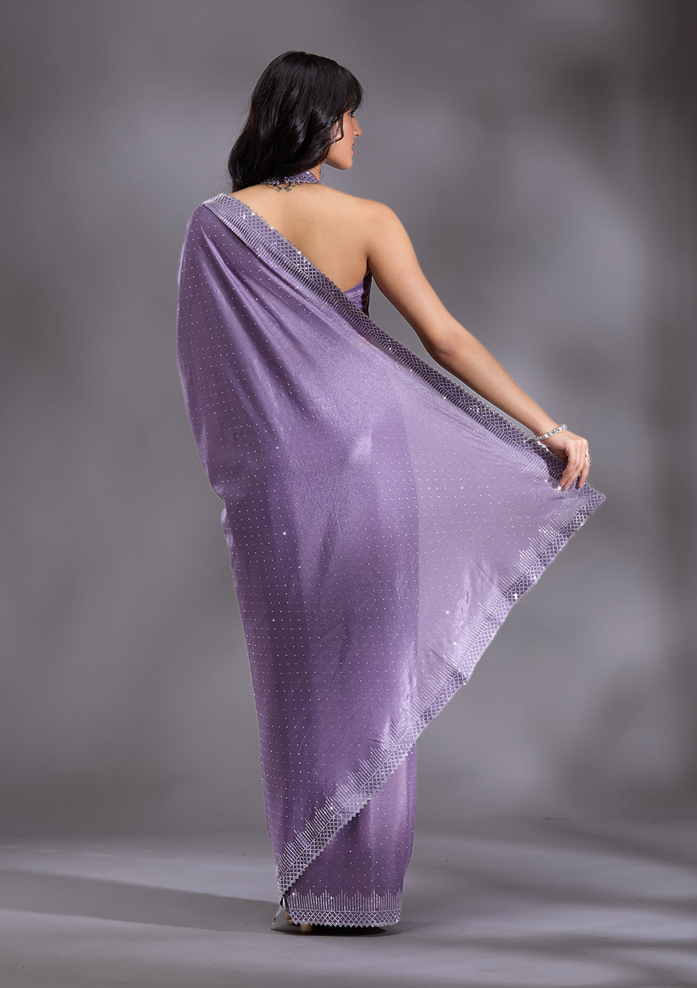 Violet Saree in Satin fabric. The Saree is elevated with Stonework (Silver) embroidery. It comes with an Unstitched blouse. Comes with the Koskii promise of premium quality.