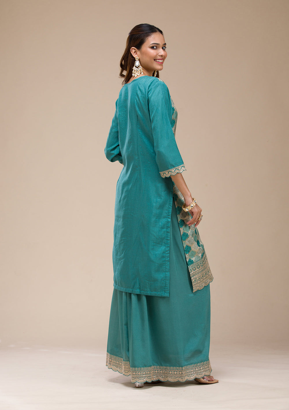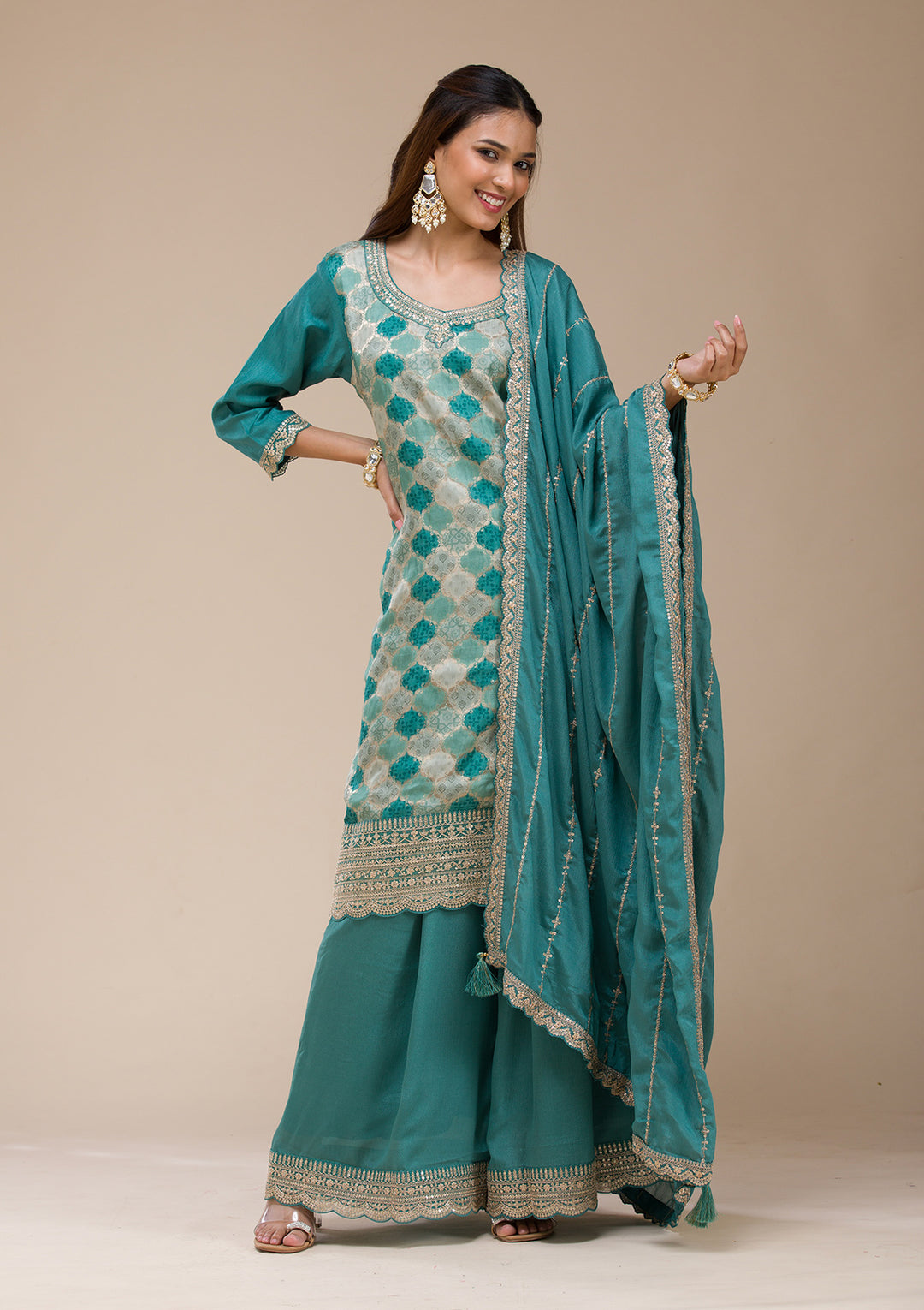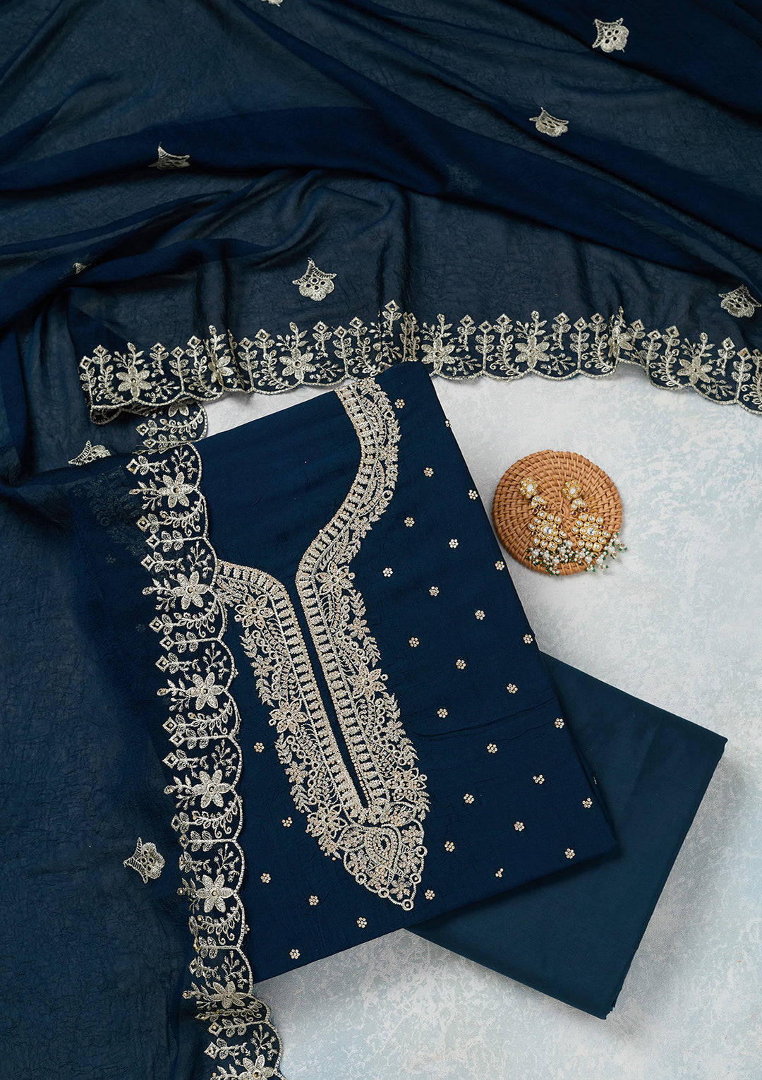 | Peacock Blue Zariwork (Gold) Soft Raw Silk Unstitched Salwar Suit | ₹ 3,192 | |