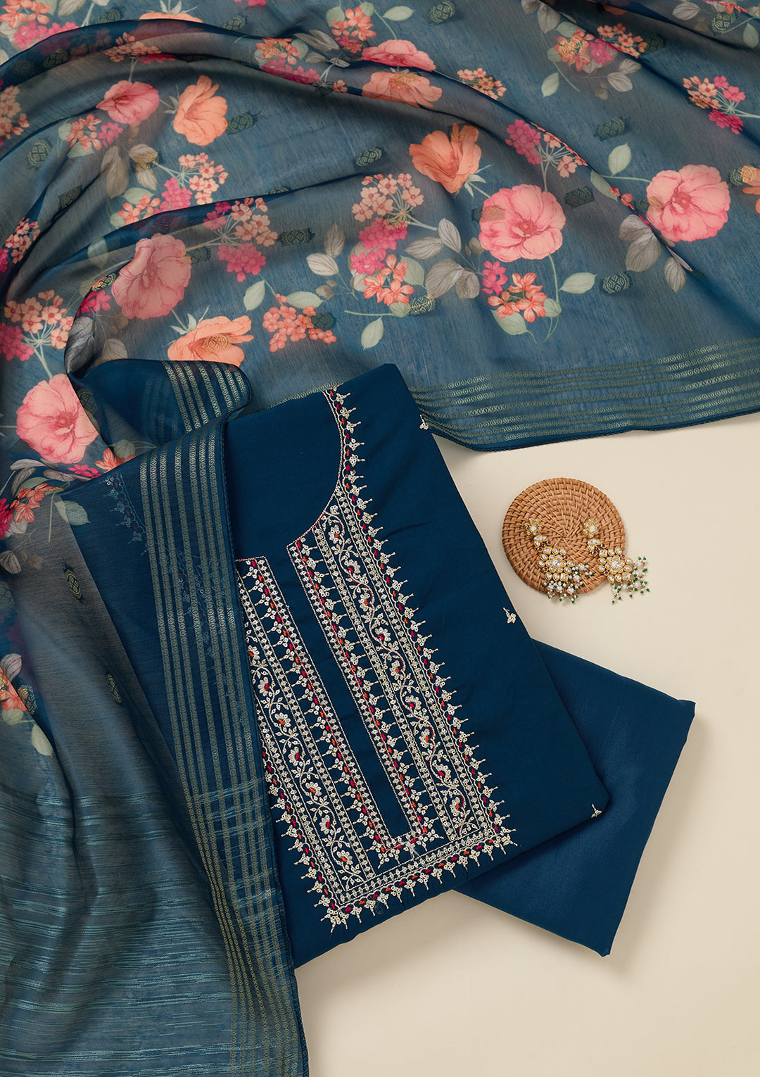 | Peacock Blue Zariwork (Silver) Semi Crepe Unstitched Salwar Suit | ₹ 3,992 | |