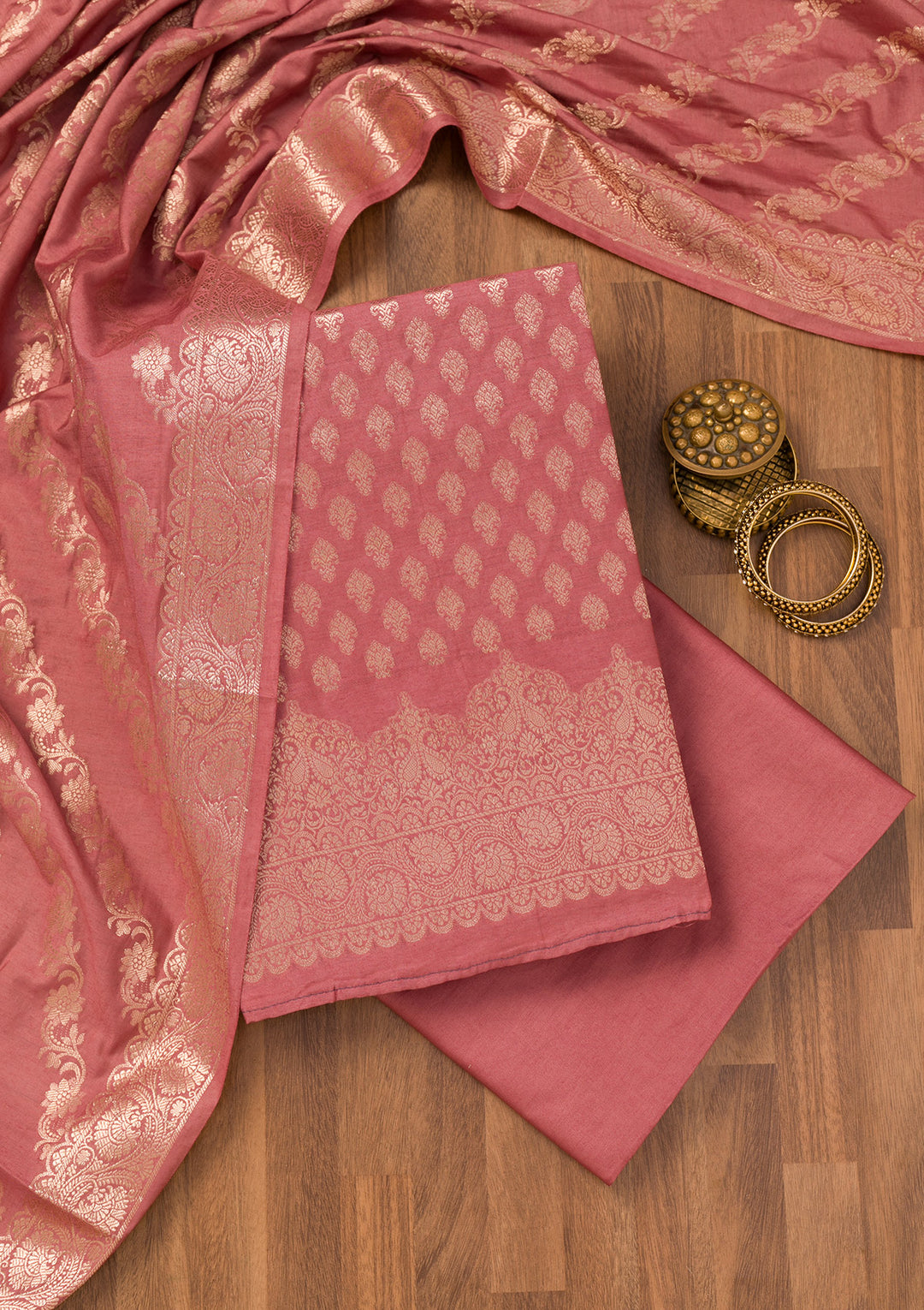 | Onion Pink Zariwork (Gold) Chanderi Unstitched Salwar Suit | ₹ 2,392 | |