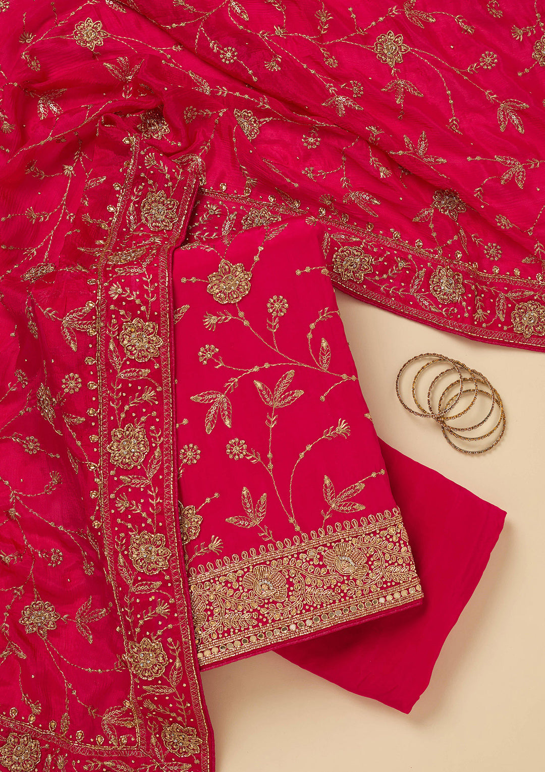 | Onion Pink Zariwork (Gold) Chinon Unstitched Salwar Suit | ₹ 3,592 | |