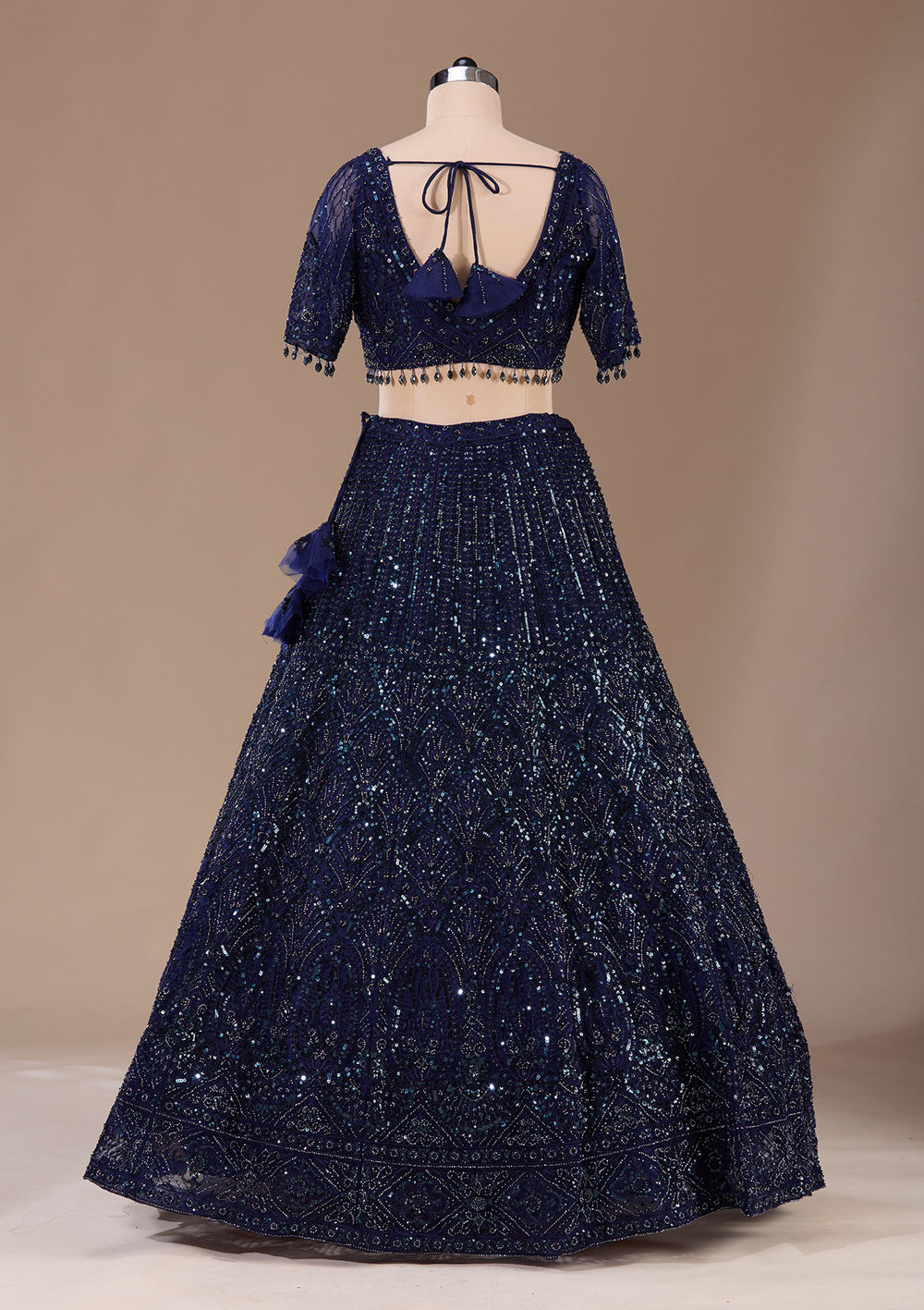 - For Cocktail Parties: Choose sleek, minimalist crop top party wear dresses for a chic and modern vibe. A Navy blue cutdana net gown is the perfect crop top dress for party.