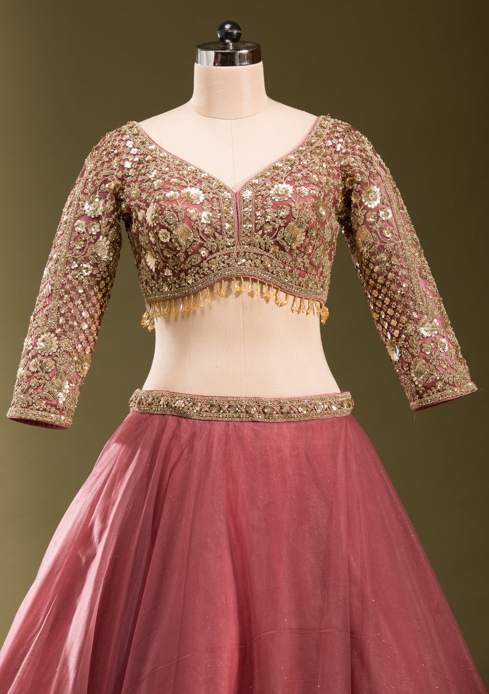 A crop top lehenga is a contemporary twist on the traditional lehenga choli. When you pair a lehenga with embroidered crop tops instead of cholis, it is known as a crop top lehenga choli. These tops are crafted in the same fabric and colour as the lehenga and are designed with intricate karigaris to create a contemporary vibe.