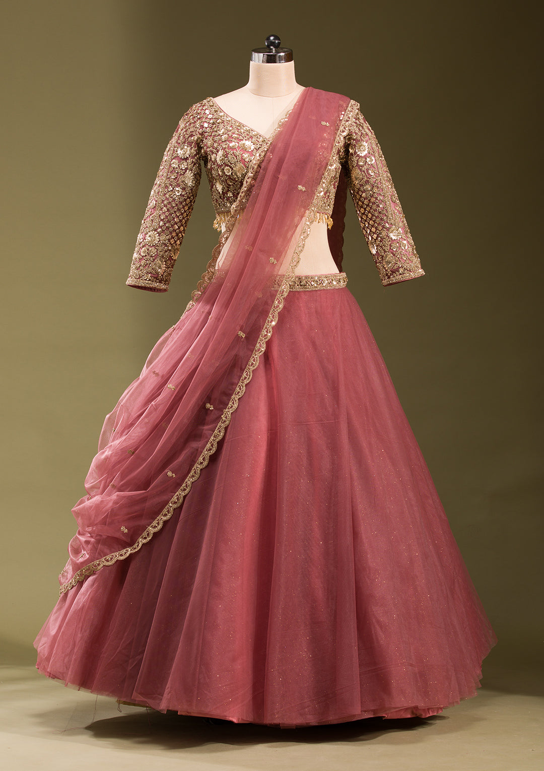 - Festive Celebrations: Let your Diwali nights be more glamorous with an onion pink net lehenga with mirror work from Koskii. The striking green dupatta can enhance your grace even more.