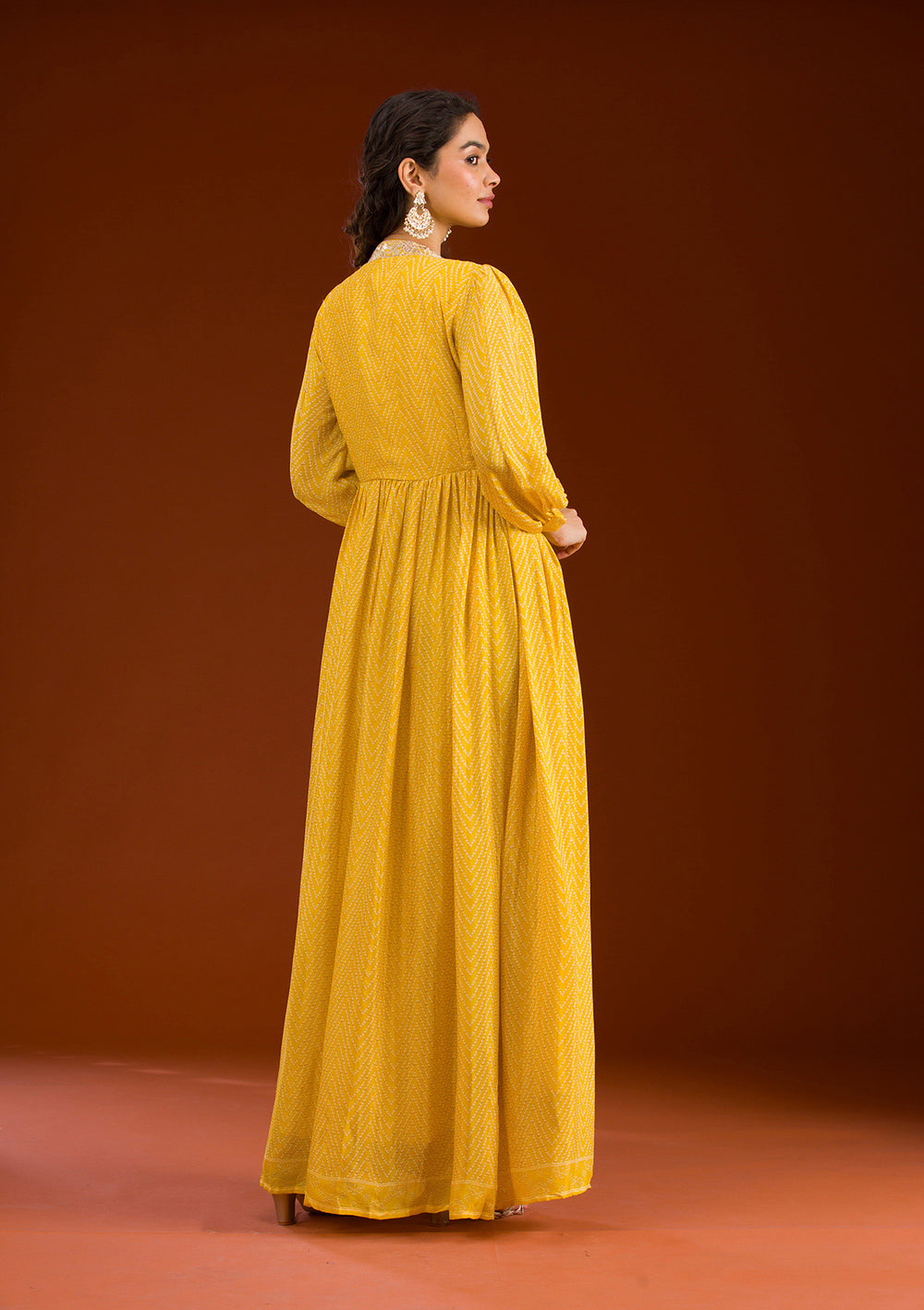 Koskii offers a huge collection of printed suits in various fabrics like organza, tissue, chanderi, etc. You can pick any fabric depending on your preference.
