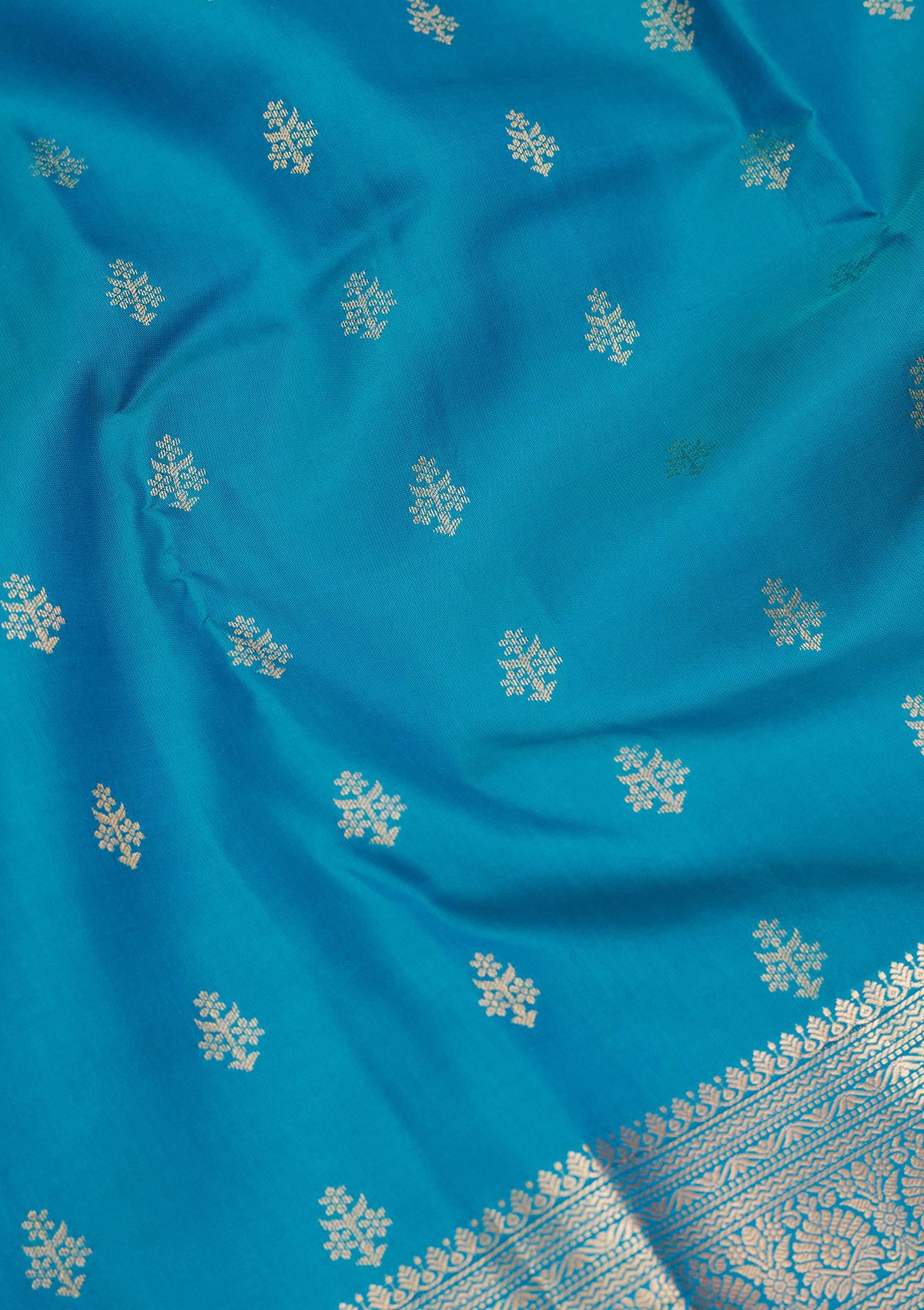 Turquoise Blue Silk Saree in Pure Silk fabric. The Silk Saree is elevated with Zariwork embroidery. It comes with an Unstitched blouse. Comes with the Koskii promise of premium quality.