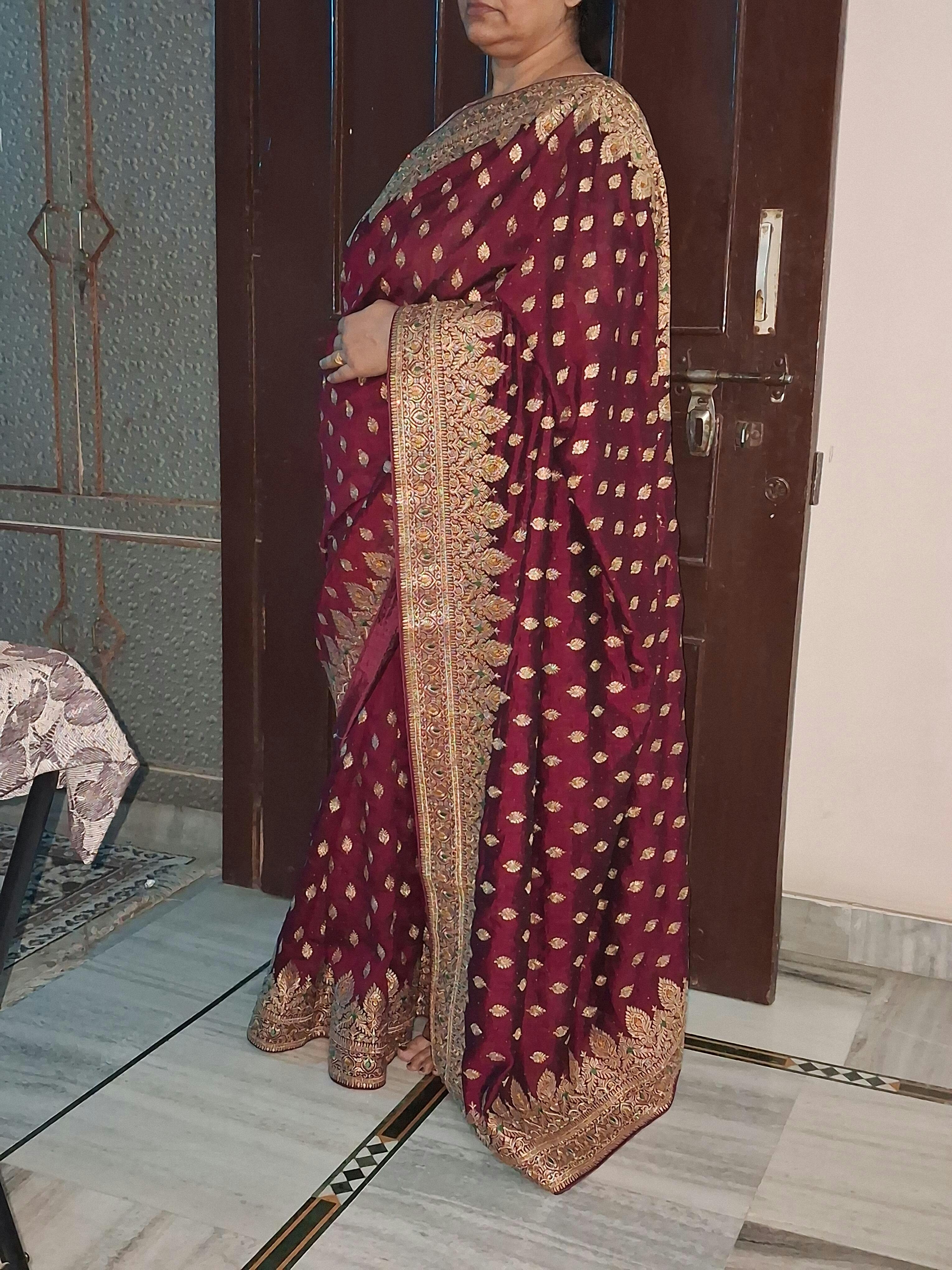 Wine Saree in Soft Raw Silk fabric. The Saree is elevated with Zariwork (Gold) embroidery. It comes with an Unstitched blouse. Comes with the Koskii promise of premium quality.