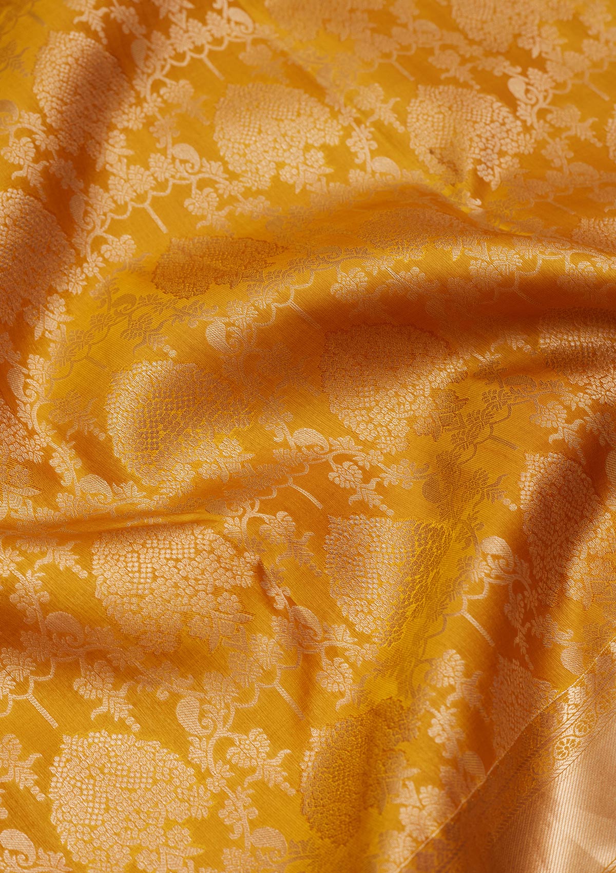Yellow Silk Saree in Pure Silk fabric. The Silk Saree is elevated with Zariwork embroidery. It comes with an Unstitched blouse. Comes with the Koskii promise of premium quality.