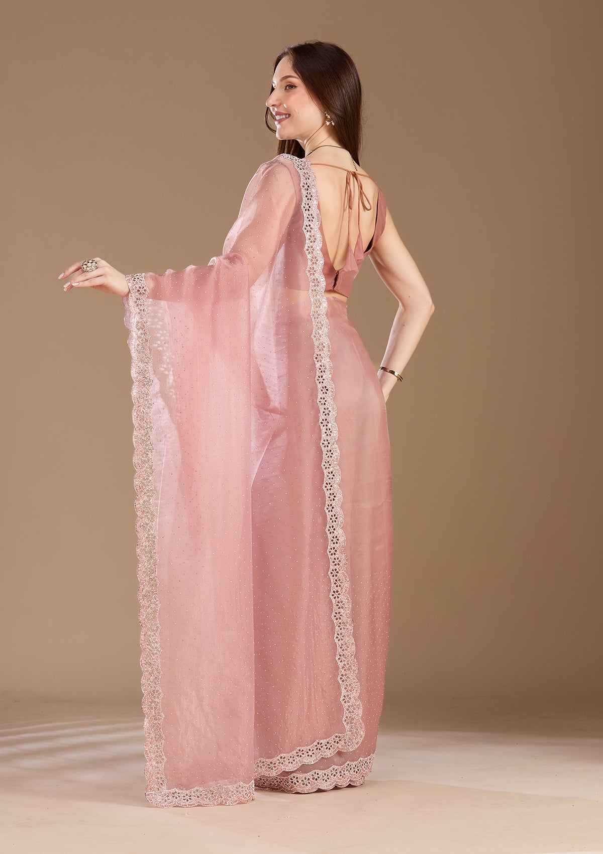 Onion Pink Saree in Tissue fabric. The Saree is elevated with Cutdana embroidery. It comes with an Unstitched blouse. Comes with the Koskii promise of premium quality.