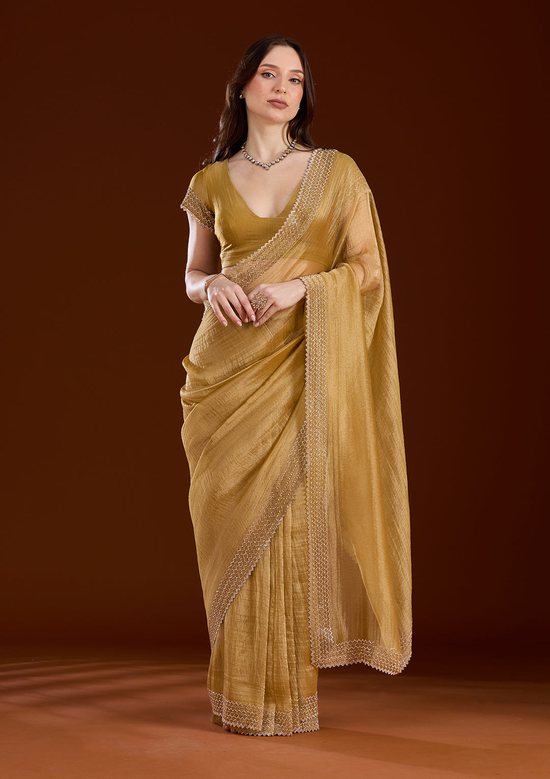 | Onion Pink Stonework (Gold) Tissue Saree | ₹ 5,243 | |