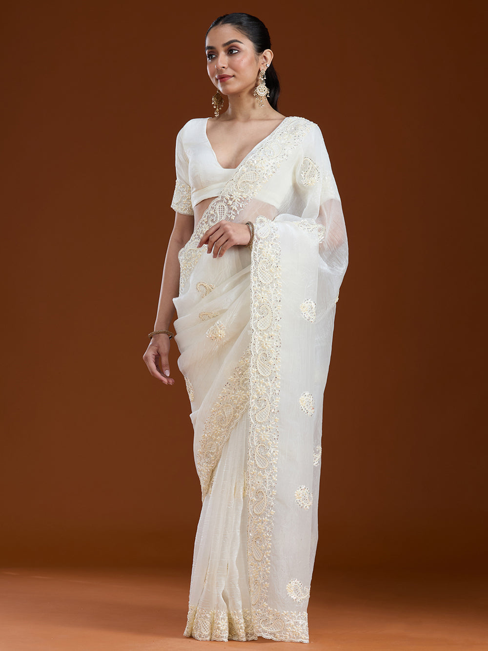 Any fashion-loving woman’s wardrobe is incomplete without a gorgeous net saree in it. Get ready in our pearl studded net Diwali saree in cream colour and steal the spotlight wherever you go.