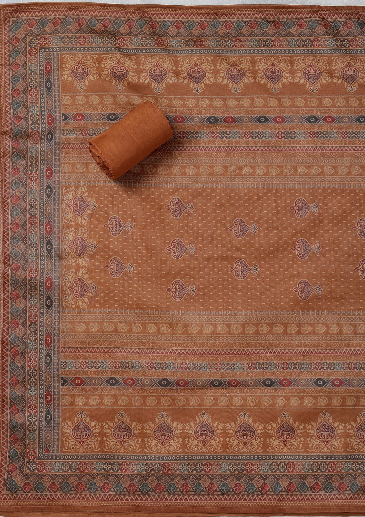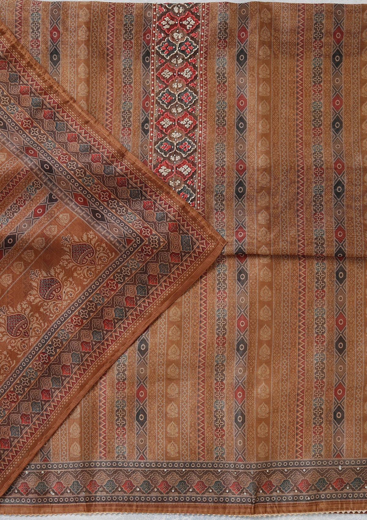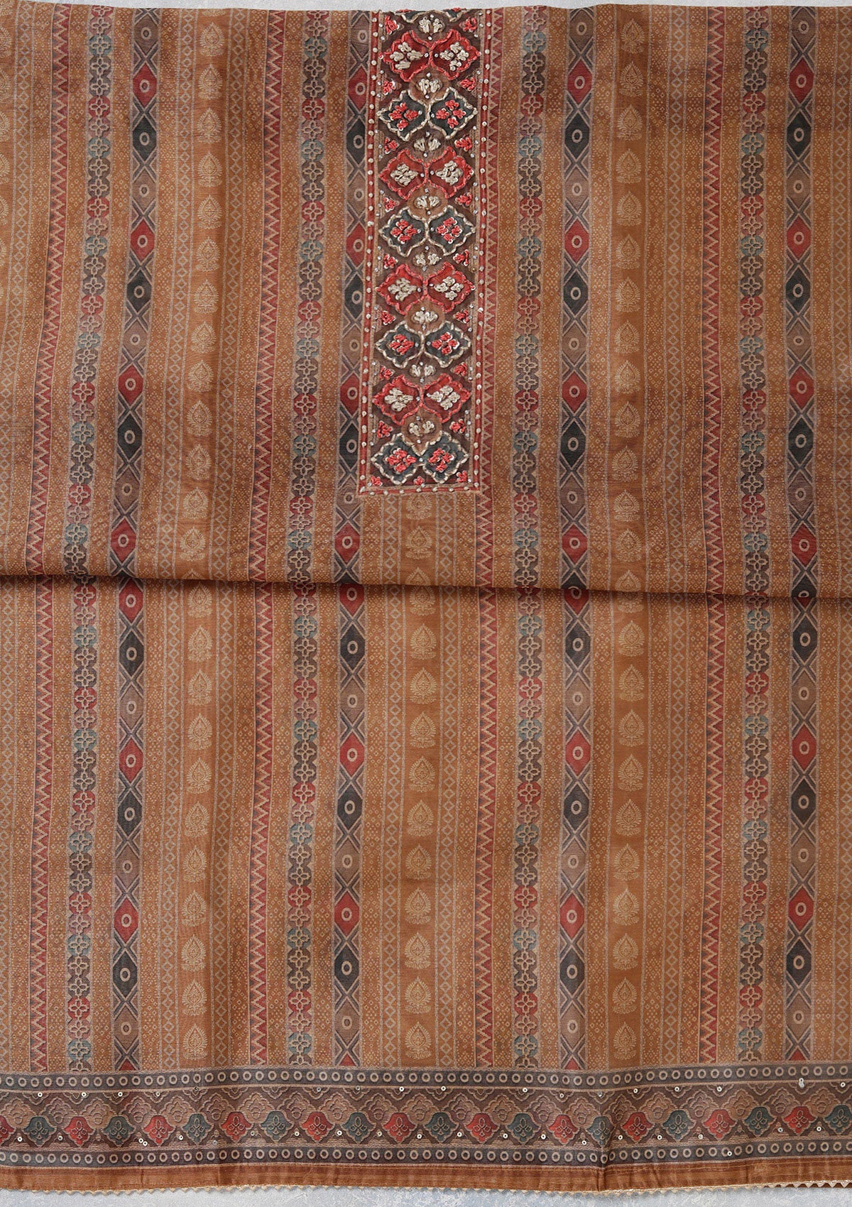 Brown Threadwork Chanderi Unstitched Salwar Suit