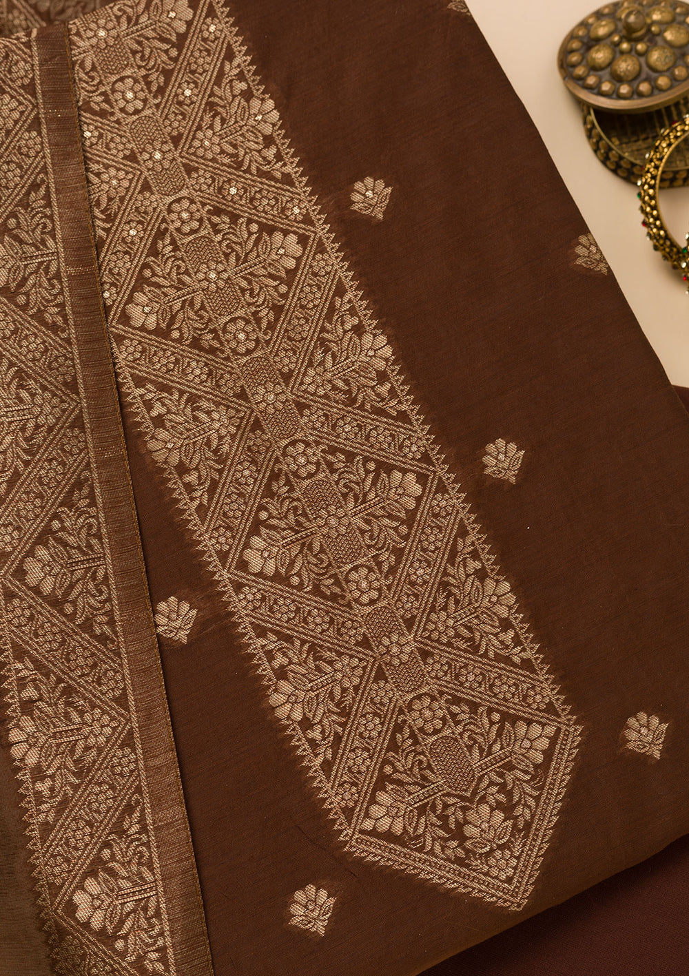 Brown Zariwork Art Silk Unstitched Salwar Suit
