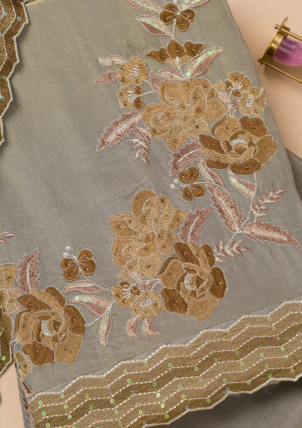 Grey Threadwork Semi Crepe Unstitched Salwar Suit